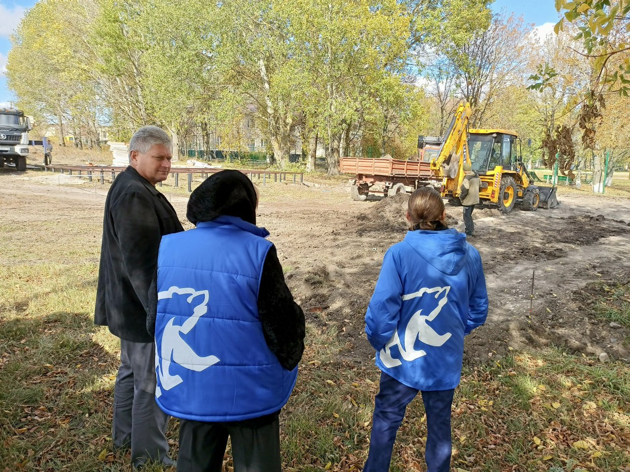 На данный момент завершены работы по разметке прилегающей территории для дальнейшего благоустройства. Заложен свайно-винтовой фундамент, ведется подготовка площадки для укладки брусчатки: снятие верхнего слоя почвы, удаление корней деревьев и кустарников, которые могут поднять часть земли под будущим покрытием, а впадины засыпаются песком с камнем.