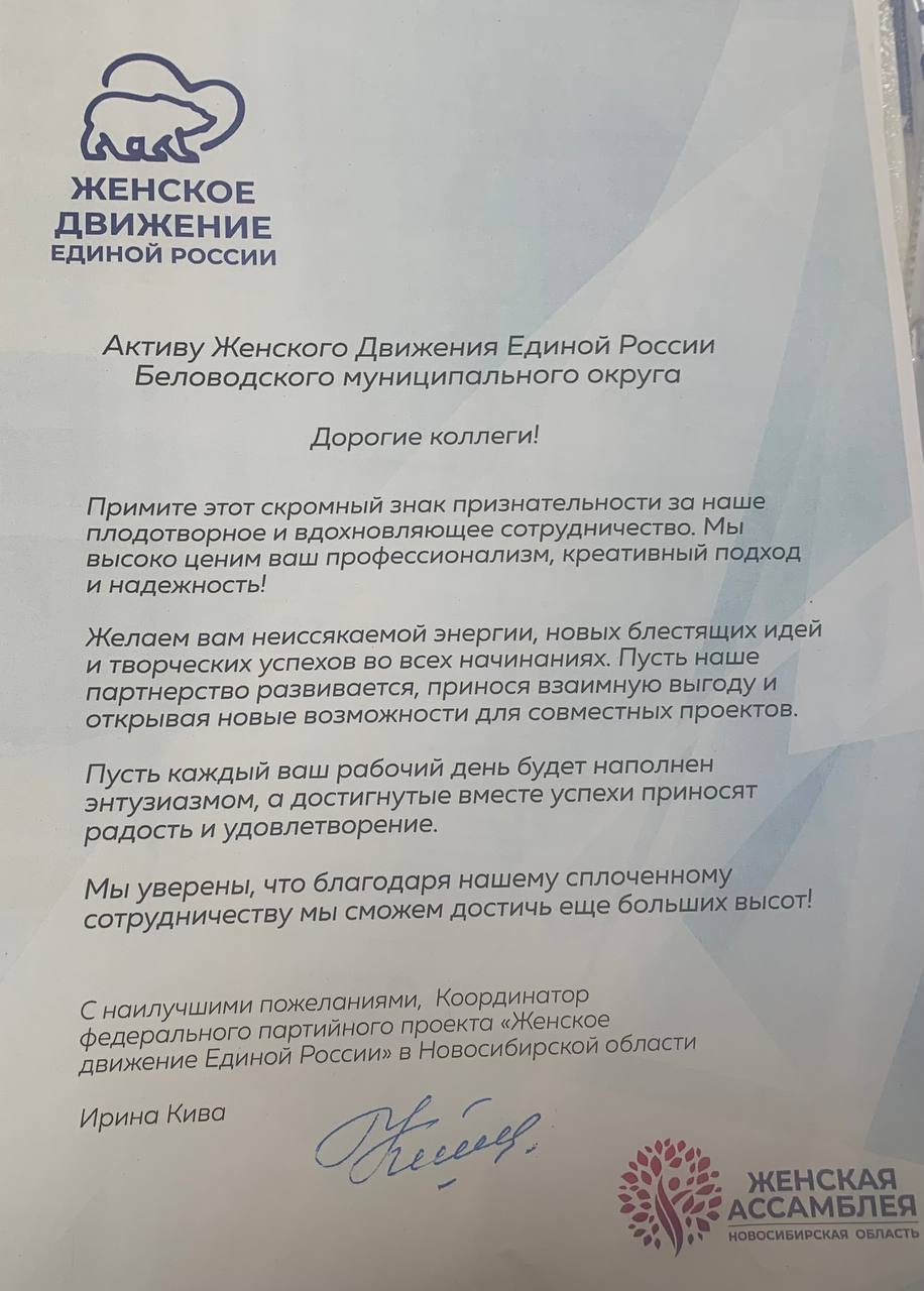 Представительницы Женского движения "Единой России" Беловодского муниципального округа получили знаки внимания от новосибирских коллег из Женской ассамблеи.