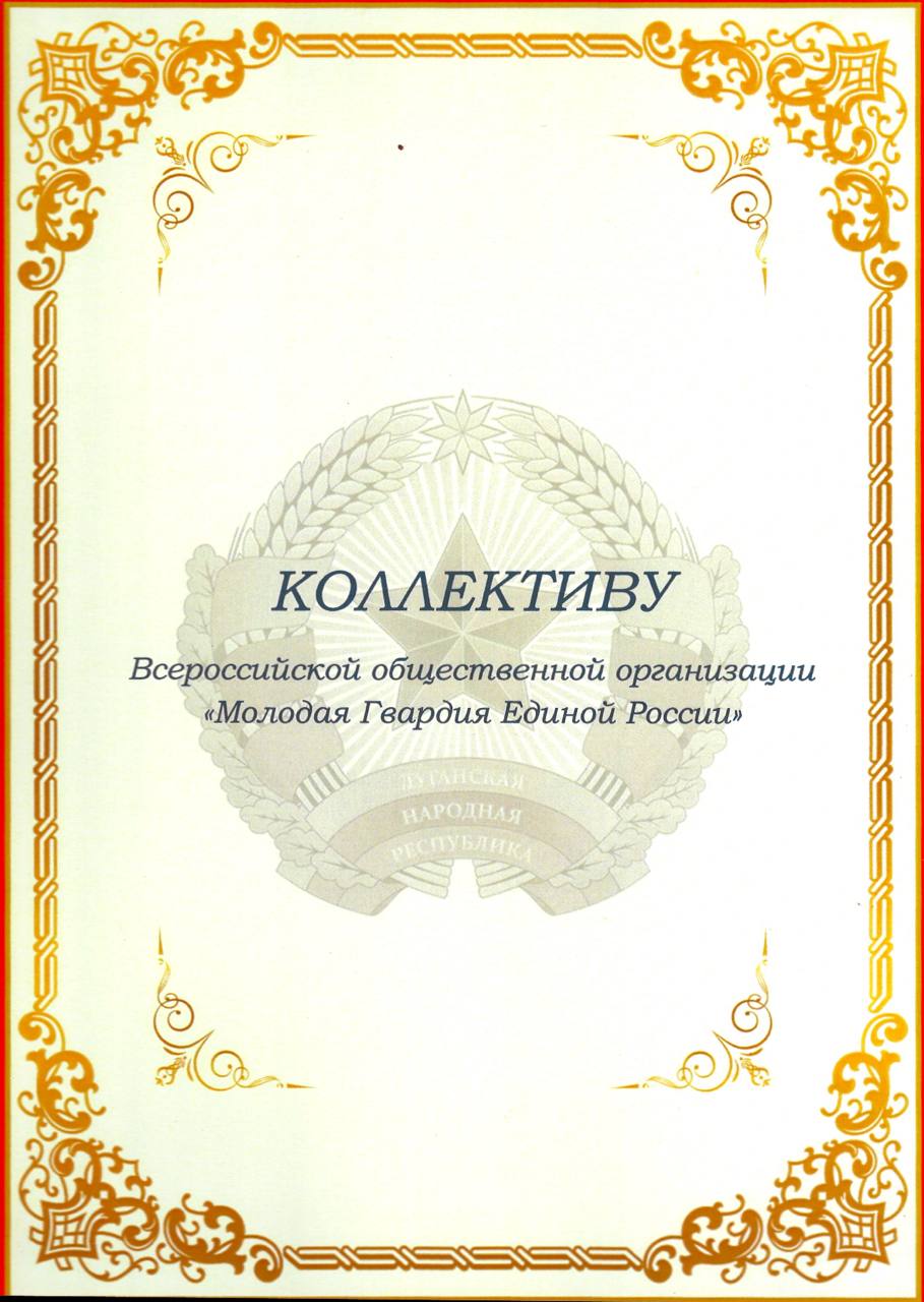 «Выражаю глубокую признательность коллективу Всероссийской общественной организации «Молодая Гвардия Единой России» за высокий профессионализм, неизменную приверженность служению Отечеству, активное участие в волонтерской деятельности, значительный вклад в оказание гуманитарной помощи жителям республики, а также в связи с отправкой 100-го отряда волонтеров»