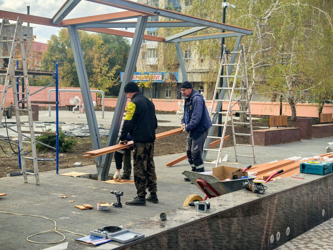 На сегодняшний день смонтированы металлические несущие конструкции для качелей. Специалисты ведут их обшивку древесиной, выполняют шлифовку и подготовку к нанесению защитных составов. В ближайшее время планируется монтаж подвесов и сидений, проверка креплений и итоговая приемка по показателям безопасности.