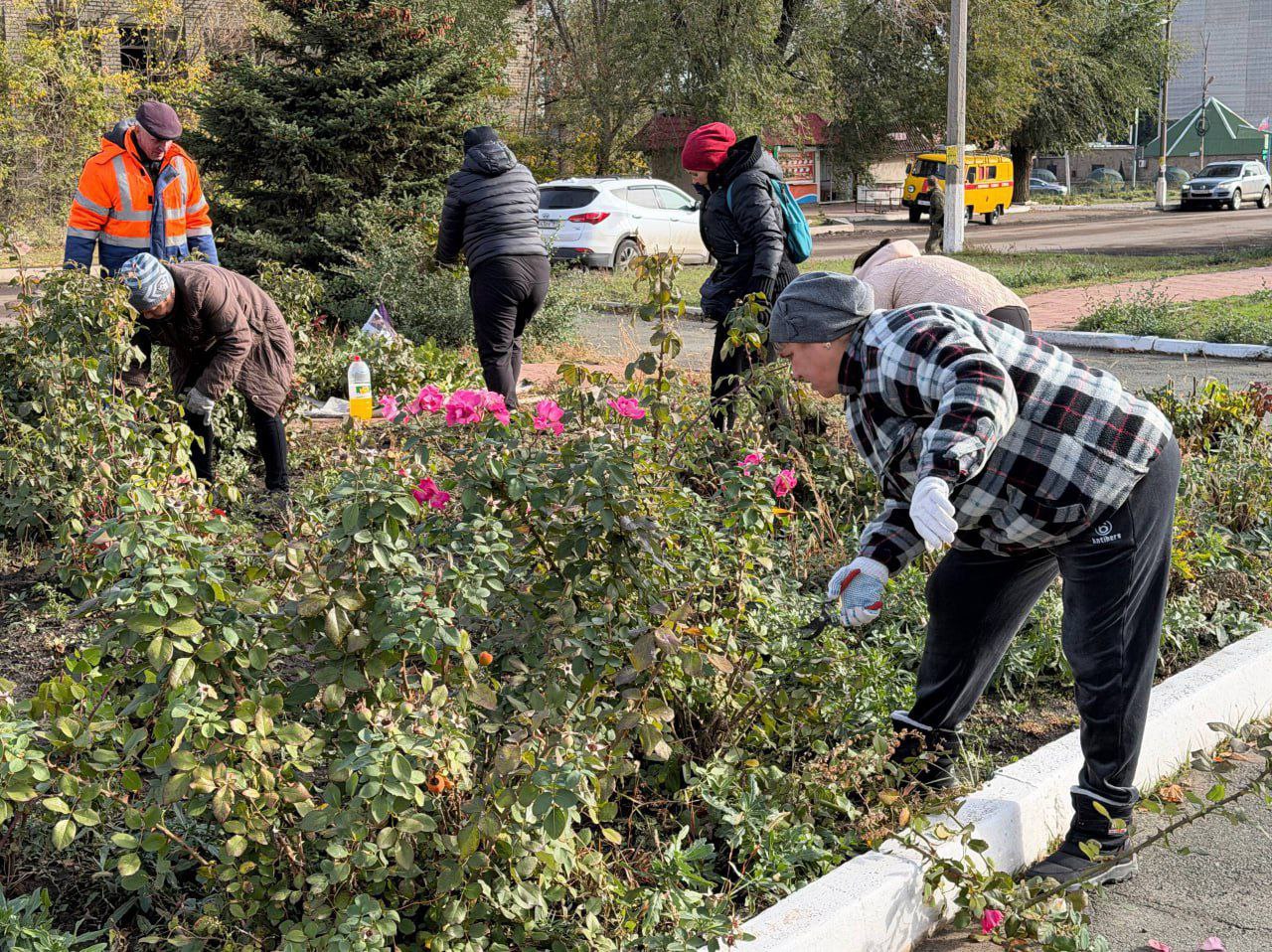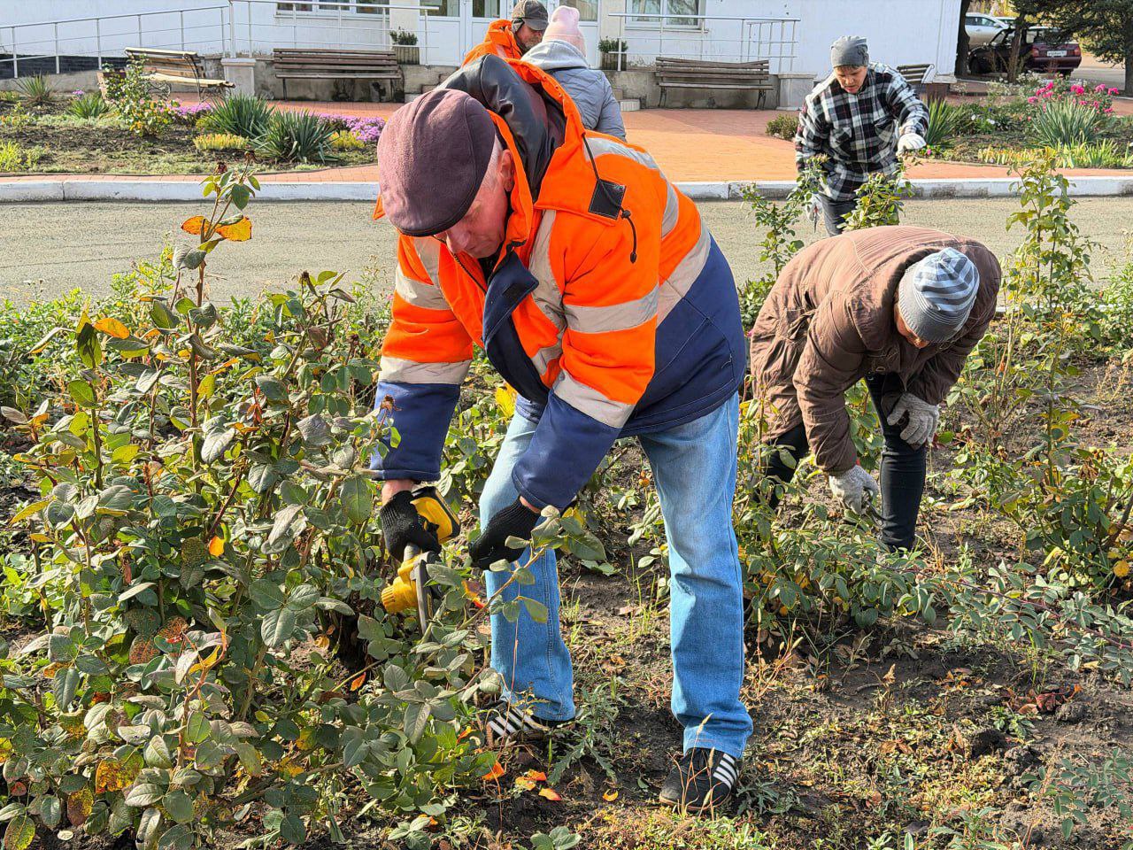 Озеленители Муниципального унитарного предприятия «Комбинат коммунальных услуг города Первомайска» обрезают высаженные кусты роз на городских клумбах, чтобы растения благополучно перезимовали и пышно зацвели весной.