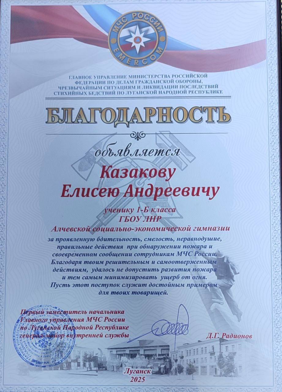 "Ученику 1-Б класса Алчевской социально-экономической гимназии, Елисею Казакову, была вручена благодарность за его невероятную бдительность, смелость, неравнодушие и правильные действия при обнаружении пожара, - сообщает телеграм-канал АСЭГ.