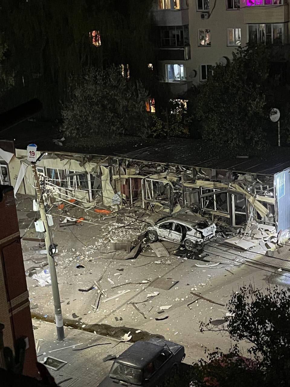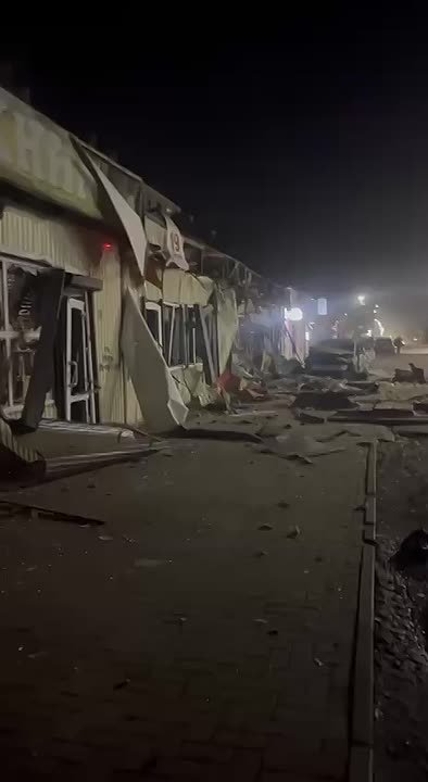 Есть пострадавший мирный житель, повреждены несколько домов и машин, в том числе 4 многоэтажки, 3 частных дома, здание медцентра и торговые павильоны.