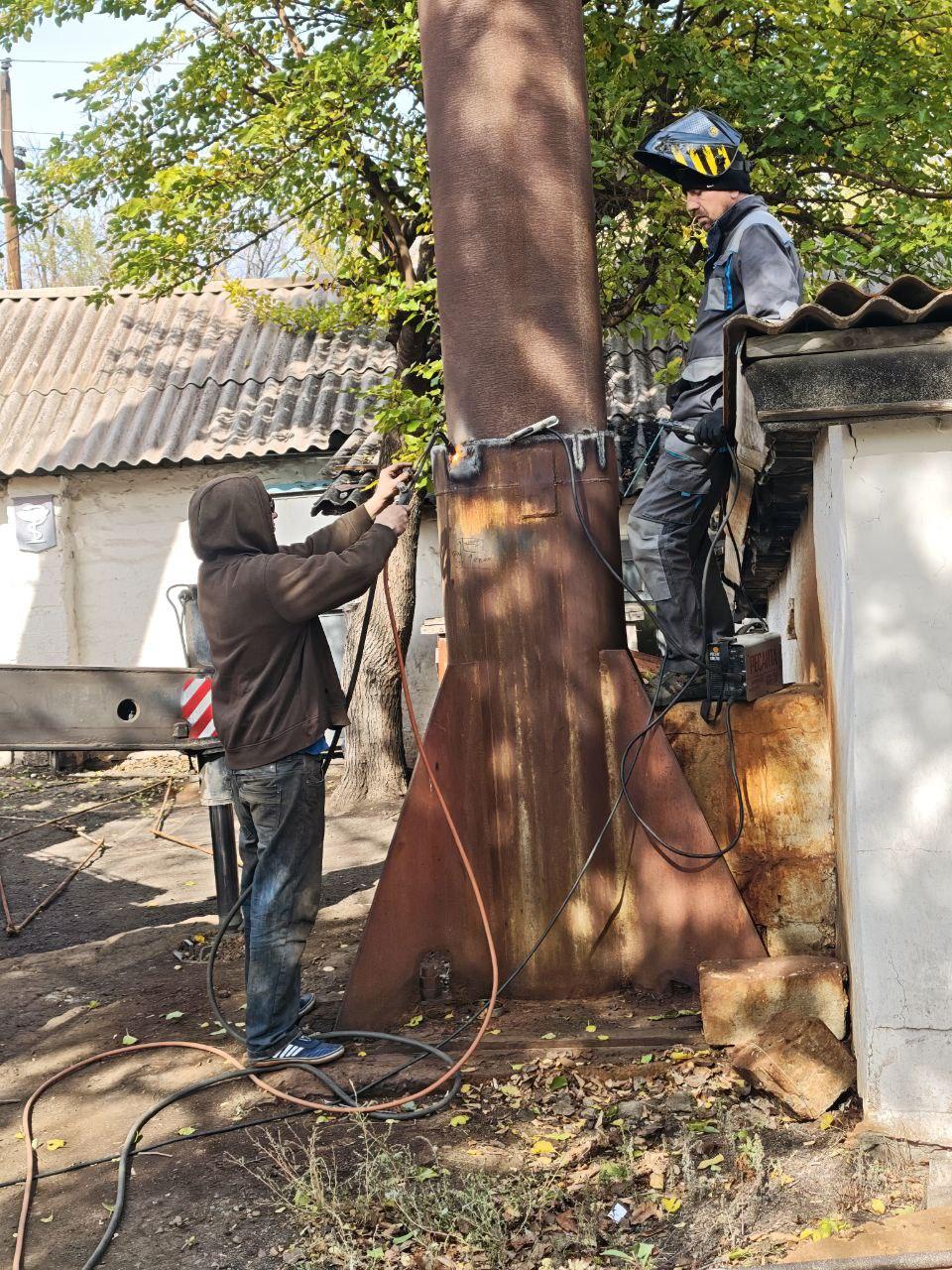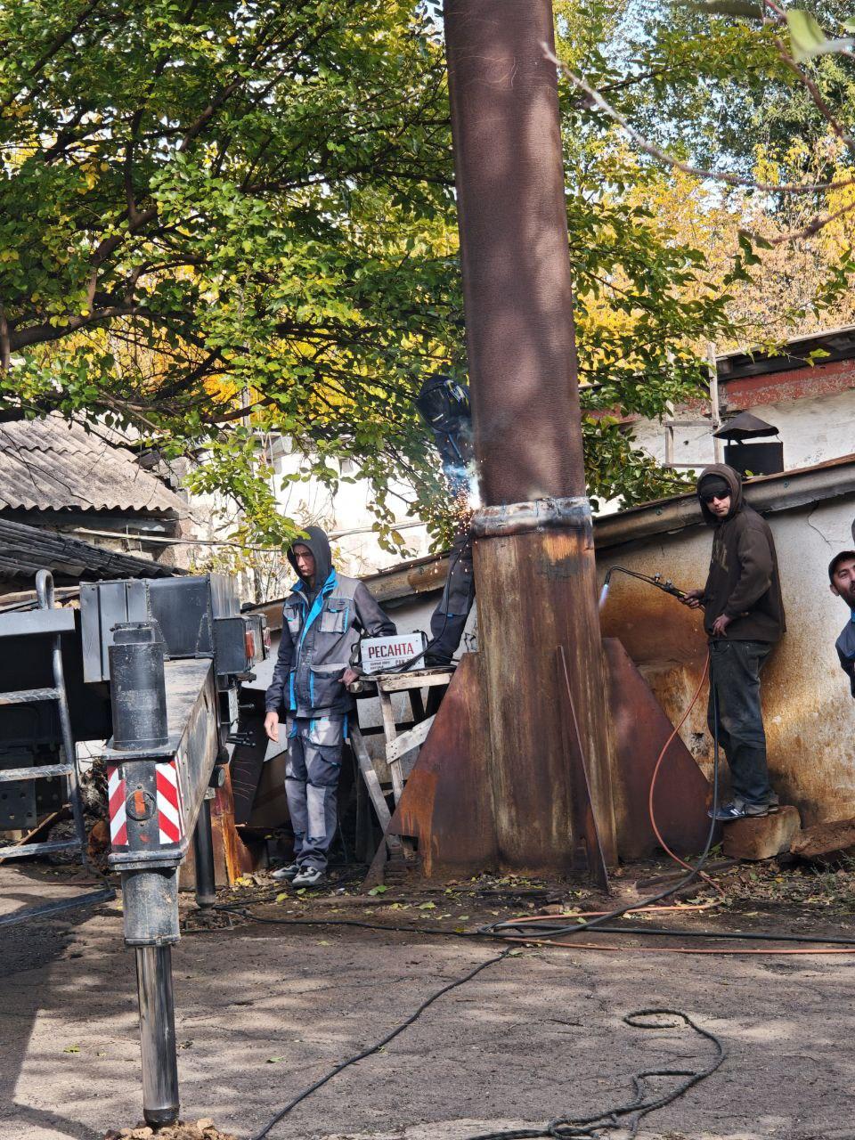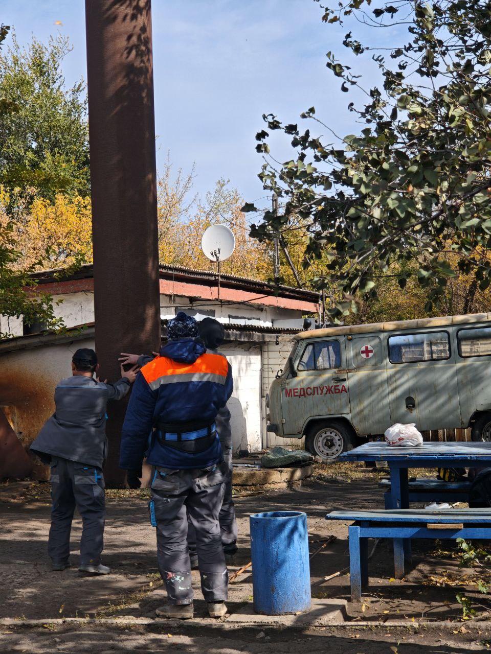 Строители демонтировали старую трубу высотой 16 м, которая прогорела от времени и находилась в аварийном состоянии. На ее место установлен новый дымоход с аналогичным техническими характеристиками. На объекте было задействовано 6 специалистов и 2 единицы техники.