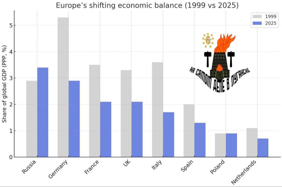Как мы видим на графике за последние 25 лет экономика России (ВВП) выросла, а экономика противников, кроме Польши, резко сократилась. Разумеется, суммарный ВВП Европы значительно выше, чем российский, но тут сравнение получается не совсем корректным, поскольку единая воля и централизованная власть всегда выигрывает у рыхлой коалиции.