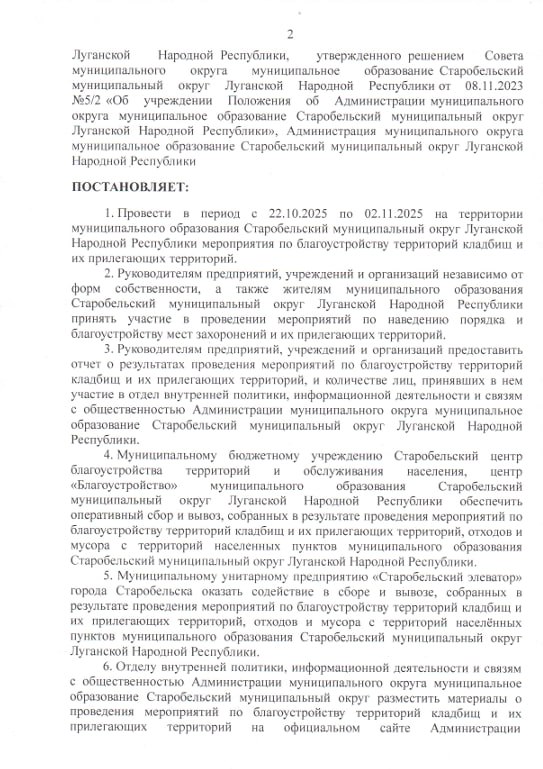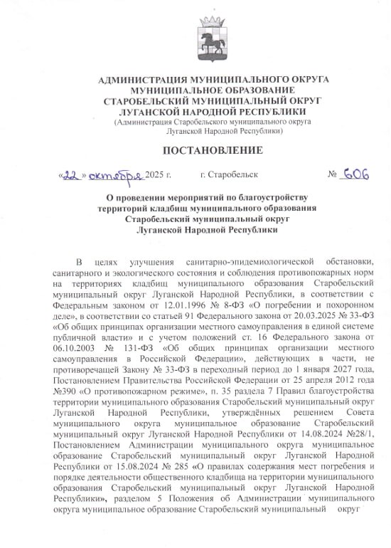 В целях улучшения санитарно-эпидемиологической обстановки, а также поддержания порядка и чистоты на территориях кладбищ, Администрация округа подписала постановление о проведении мероприятий по благоустройству кладбищ и их прилегающих территорий. Работы будут проводиться с 22 октября по 2 ноября 2025 года.