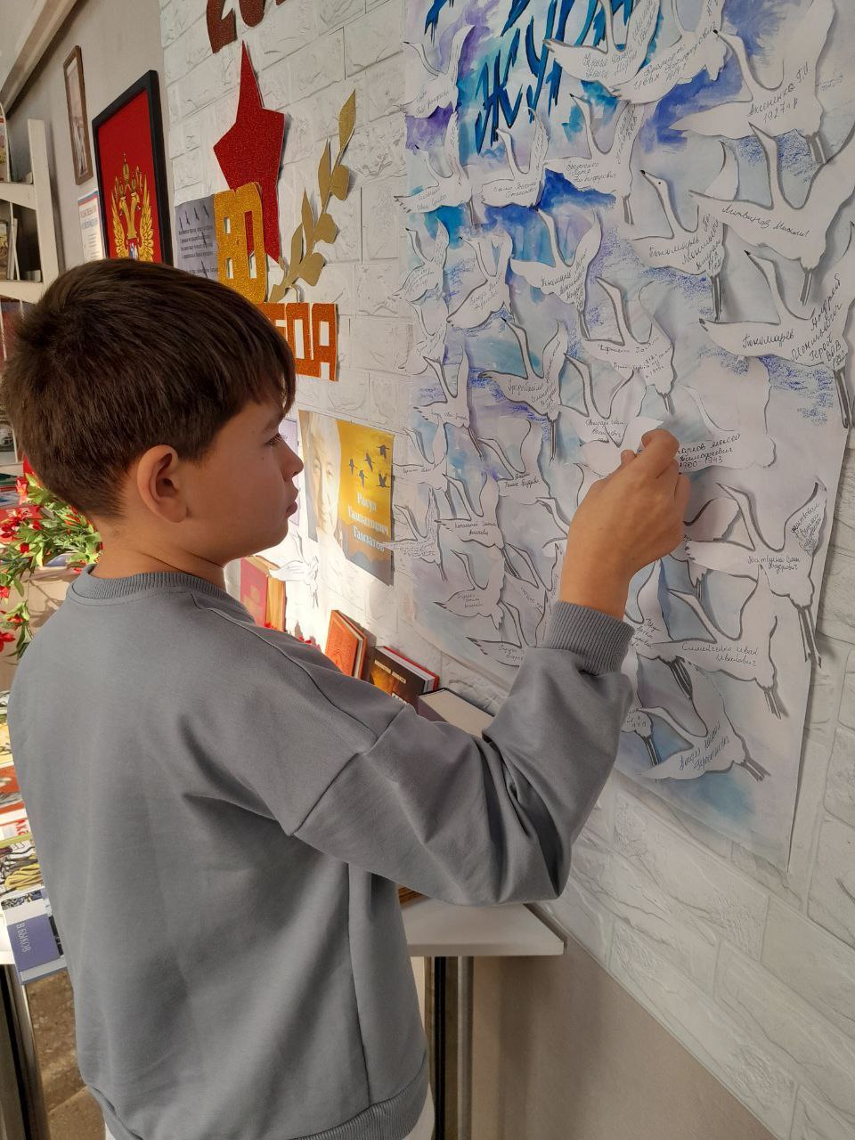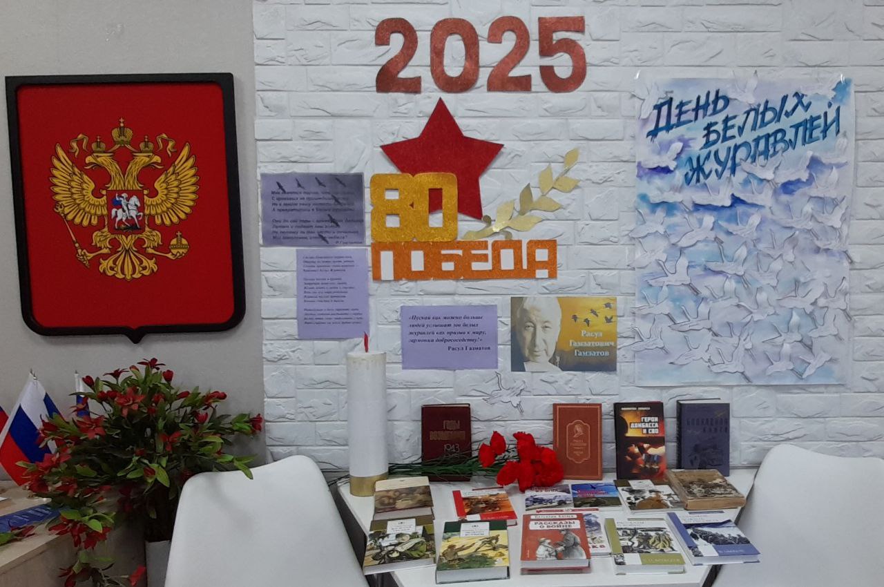 На выставке представлены литературные произведения, посвящённые Великой Отечественной войне, а также тематический плакат с изображением белых журавлей, символизирующих светлую память о павших героях и надежду на мирное будущее. В современном контексте данный праздник имеет важное значение для мирового сообщества.