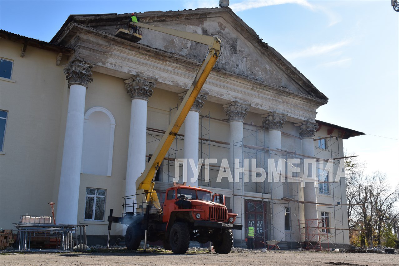 Фасад здания, архитектурные колоны, лепнина и барельеф клуба находятся на этапе восстановления. Подрядной организацией ведутся работы по удалению старого покрытия и нанесению слоя штукатурки «Короед», выполнена замена окон и планируется установка входных дверей.