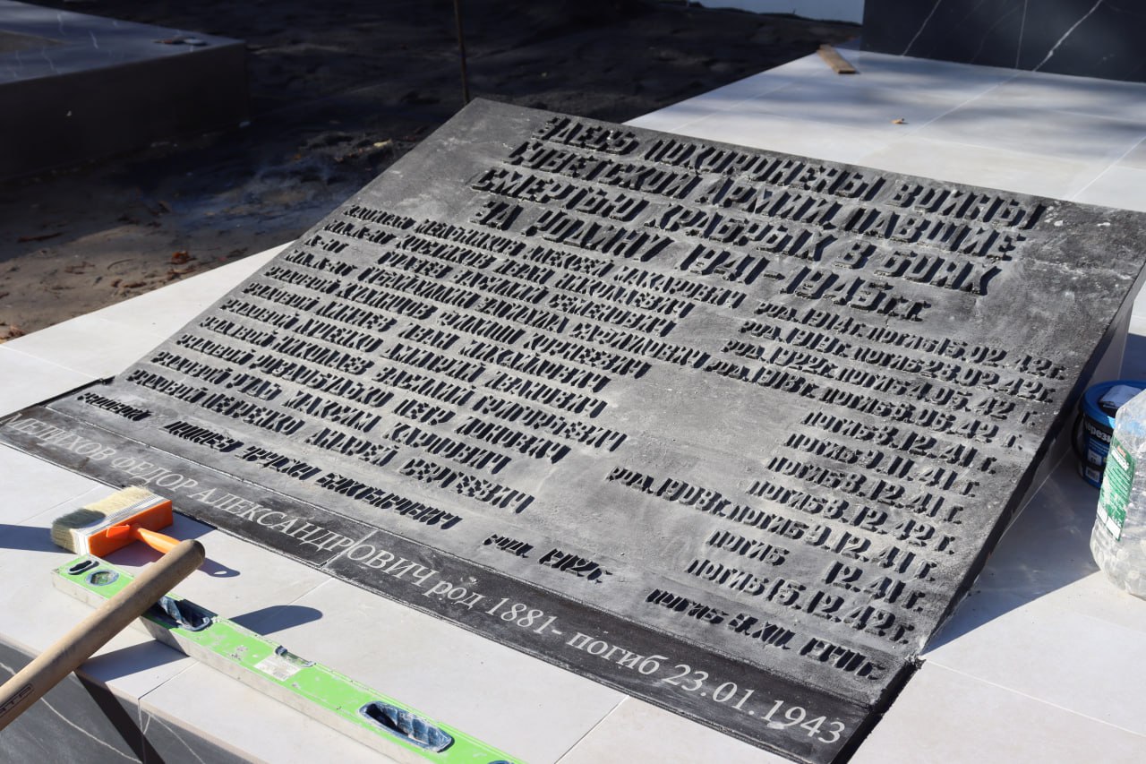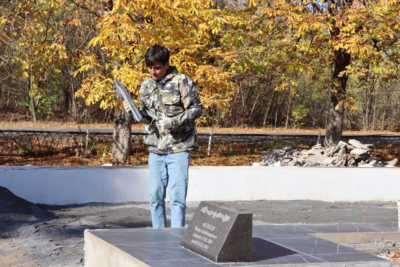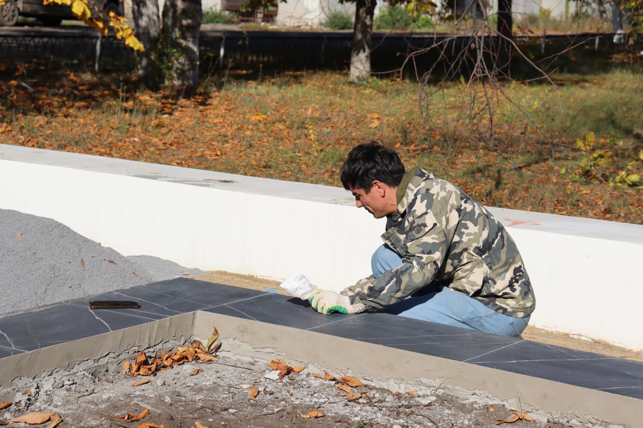 Провести ремонт в таком знаковом месте — это особая ответственность. Работы выполняет строительная компания ООО «Плаза». Средства – из местного бюджета. Сейчас строители занимаются облицовкой основания надгробия керамогранитом, а всю территорию мемориала вымостят тротуарной плиткой. Это позволит не только придать комплексу достойный и ухоженный вид, но и сохранить его для будущих поколений.