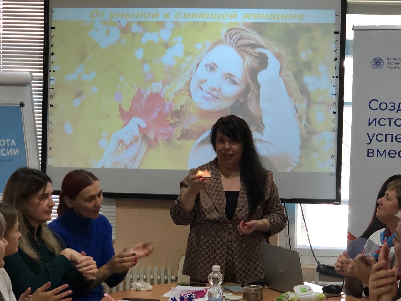 Сегодня в территориальном отделении Государственного казенного учреждения «Республиканский центр занятости населения Луганской Народной Республики» в Беловодском районе прошло заседание женского клуба «Женщина в деле» на тему «От унылой к сияющей женщине». Спикером встречи стала хозяйка салона красоты, косметолог, мастер по ногтевому сервису, рунолог - Ольга Борисенко.