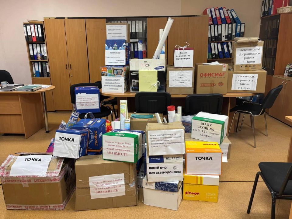 В Перми педагоги вместе с учащимися и родителями 32 образовательных учреждений собрали гуманитарную помощь для школ и детсадов города Северодонецка. В сборе участвовали 12 детских садов и 20 школ.