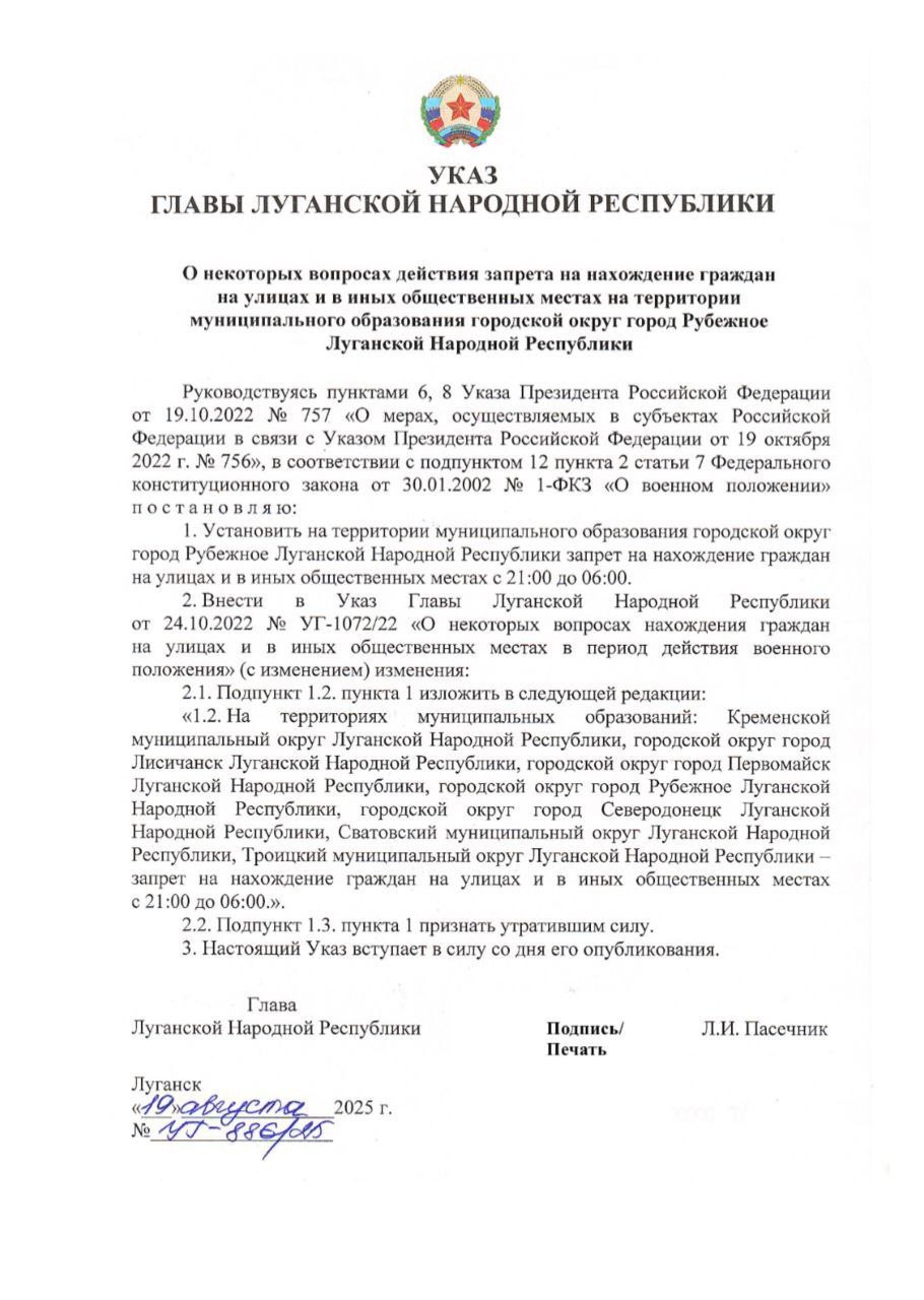 Согласно Указу Главы ЛНР Леонида Пасечника от 19.08.2025, комендантский час установлен: