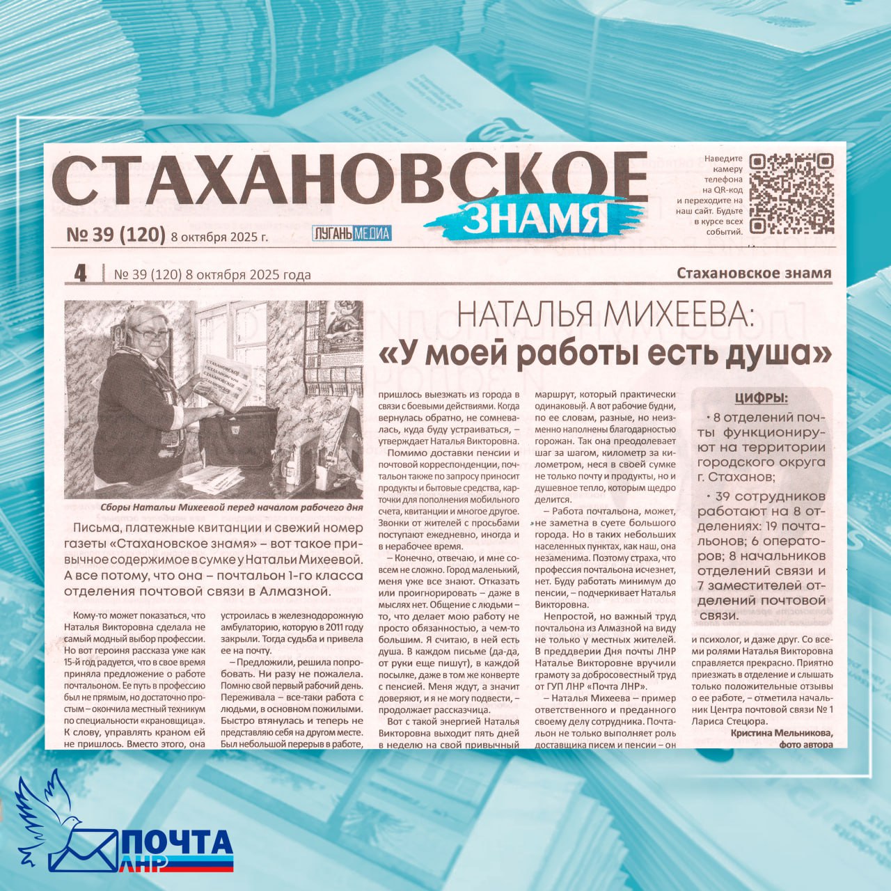 8 октября 2025 года в № 39 (120) газеты «Стахановское знамя» вышел материал под заголовком «У моей работы есть душа», посвящённый нашему коллеге — почтальону Наталье Викторовне Михеевой.