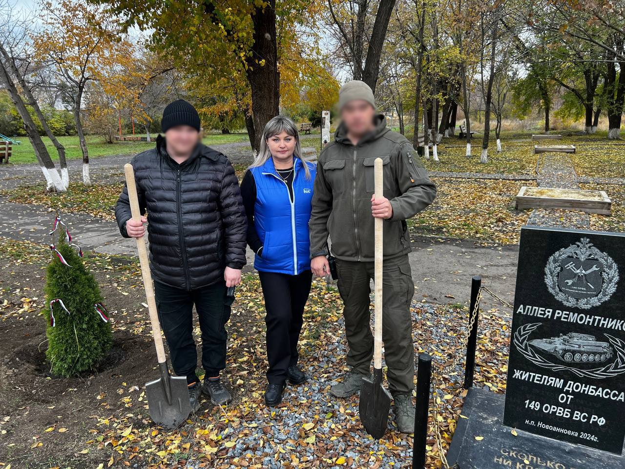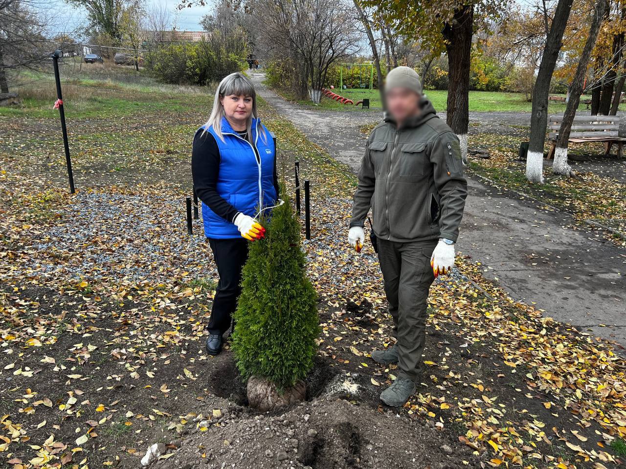 Начальник ОПЖ, секретарь первичного отделения партии «Единая Россия» Наталья Толощук вместе с военнослужащими Вооружённых Сил Российской Федерации высадили две туи на Аллее ремонтников.