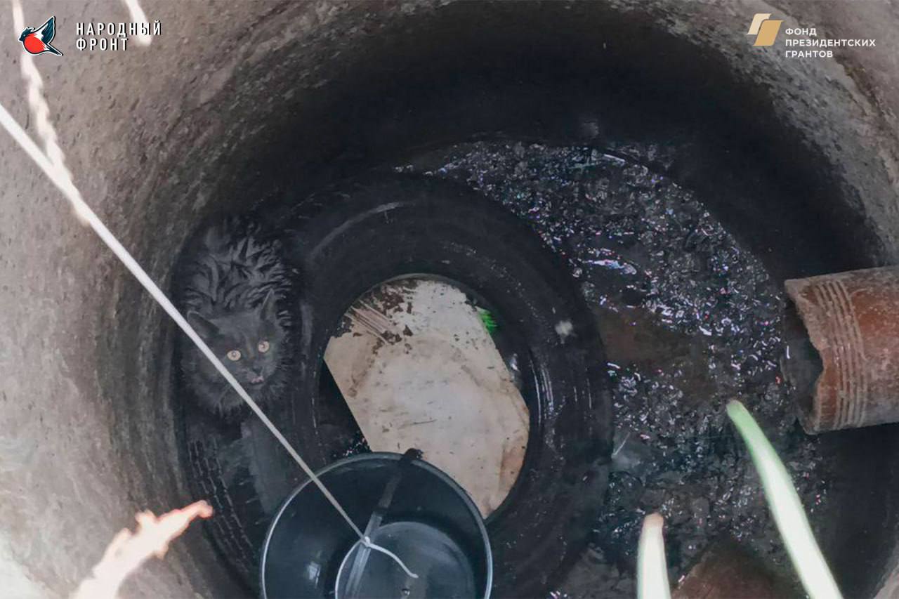 Беззащитный кот по неосторожности упал в канализационную яму, но, к счастью, коллеги из Алчесвкой Молодёжки оказались рядом!