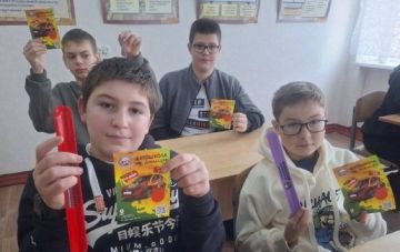 На память о встрече почтовики подарили ребятам подборку местных газет, открытки и фирменный календарь на 2026 год от «Почты ЛНР».