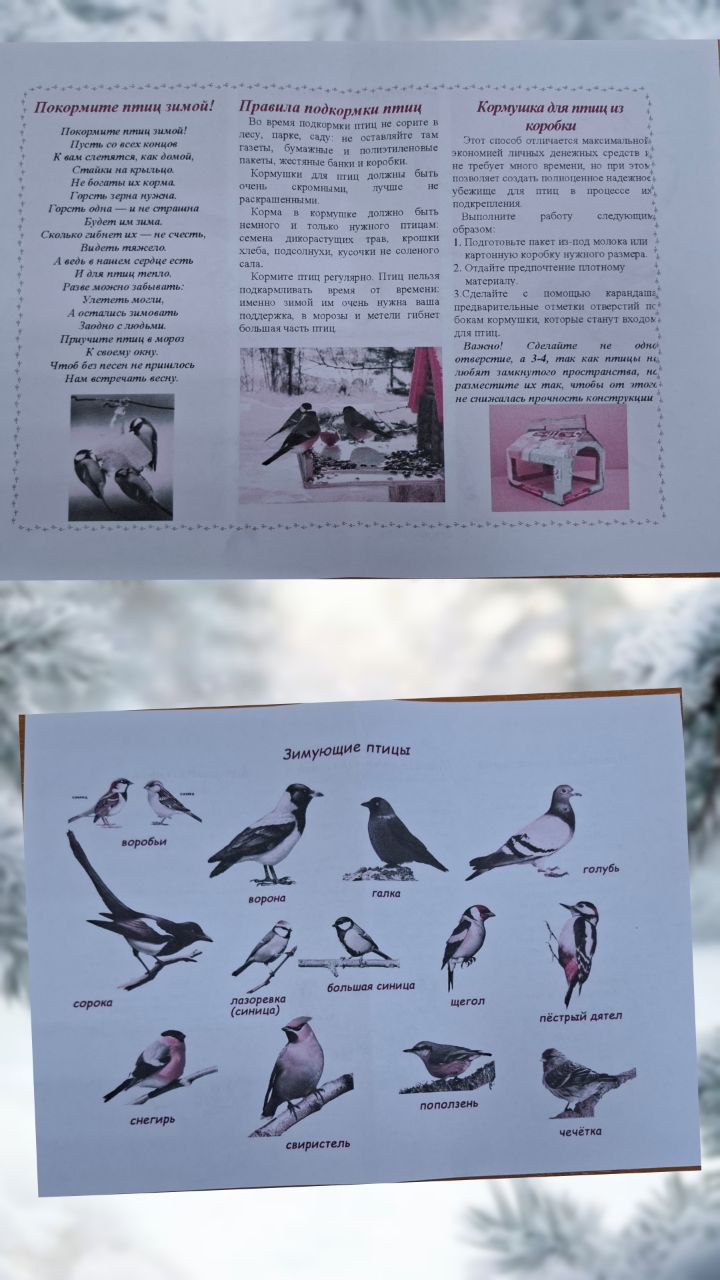 Помимо участия в акции, первоклассники раздали информативные листовки в рамках своей школьной акции "Помоги зимующим птицам", где была информация о птицах, которые остаются на зимовку в городах и лесах, и о том, как помогать им в холодные зимние месяцы.