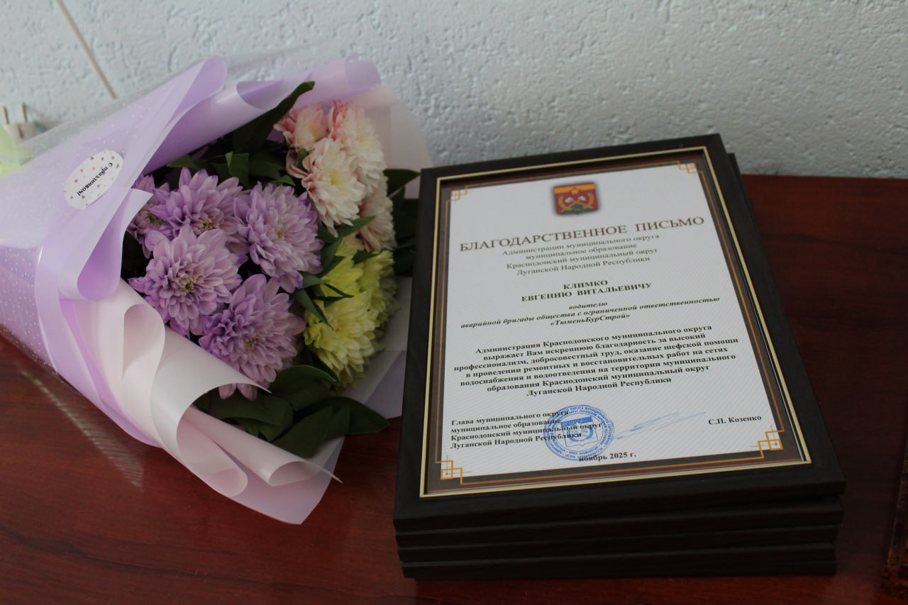 В знак признания заслуг вместе с Владимиром Шавлаем в торжественной обстановке передали грамоты Министерства строительства и жилищно-коммунального хозяйства Луганской Народной Республики и вручили Благодарственные письма Администрации Краснодонского муниципального округа.