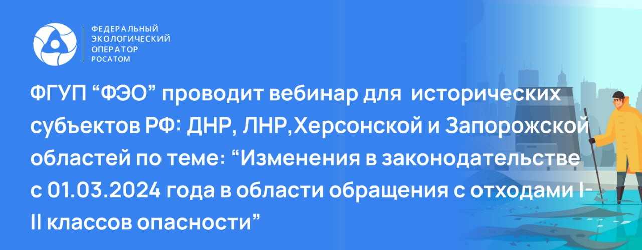 ФГУП «Федеральный экологический оператор» 26.11.2025 проведет бесплатный вебинар по теме: «Изменения в законодательстве с 01.03.2024 года в области обращения с отходами I-II классов опасности»