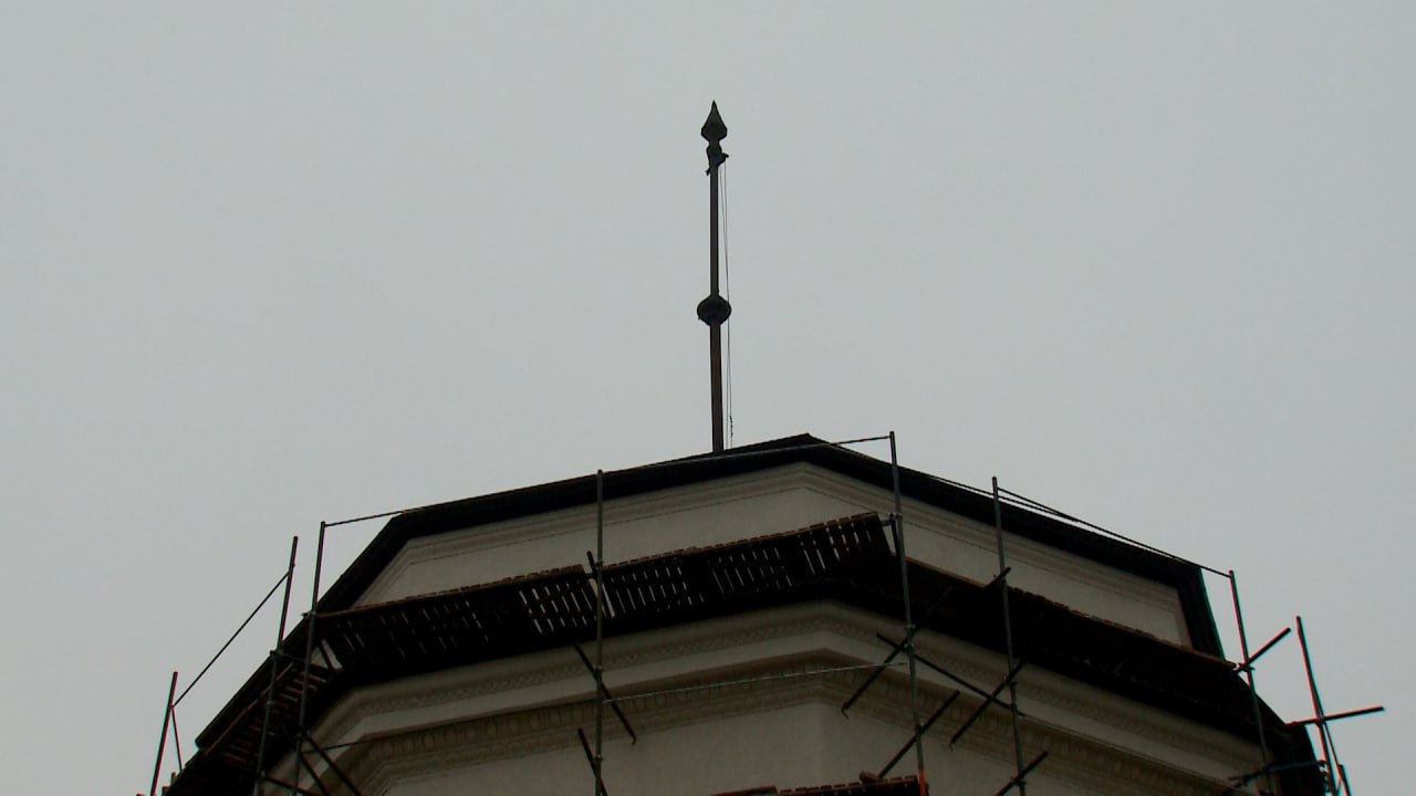 Кроме того, начался монтаж железной конструкции под шпилем. Ранее специалисты завершили монтаж новой кровли на башне и тщательно очистили шпиль от многолетних загрязнений, вернув ему прежний вид.