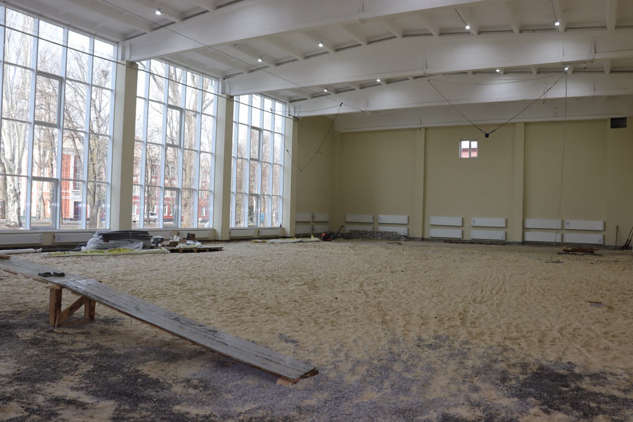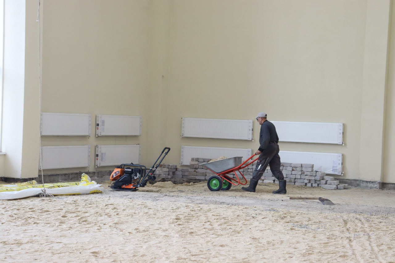 Сейчас строители готовят основание под бетонную стяжку пола, засыпают щебень и песок. После этого будет уложен специальный спортивный линолеум — современное и безопасное покрытие для занятий.