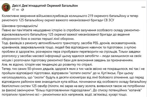 Военнослужащих ремонтного батальона 125-й отдельной тяжёлой механизированной бригады, которые ещё недавно открыто протестовали против перевода неподготовленных специалистов в штурмовые группы и даже угрожали массовым отказом от выполнения приказов, командование отправило на линию боевого соприкосновения.