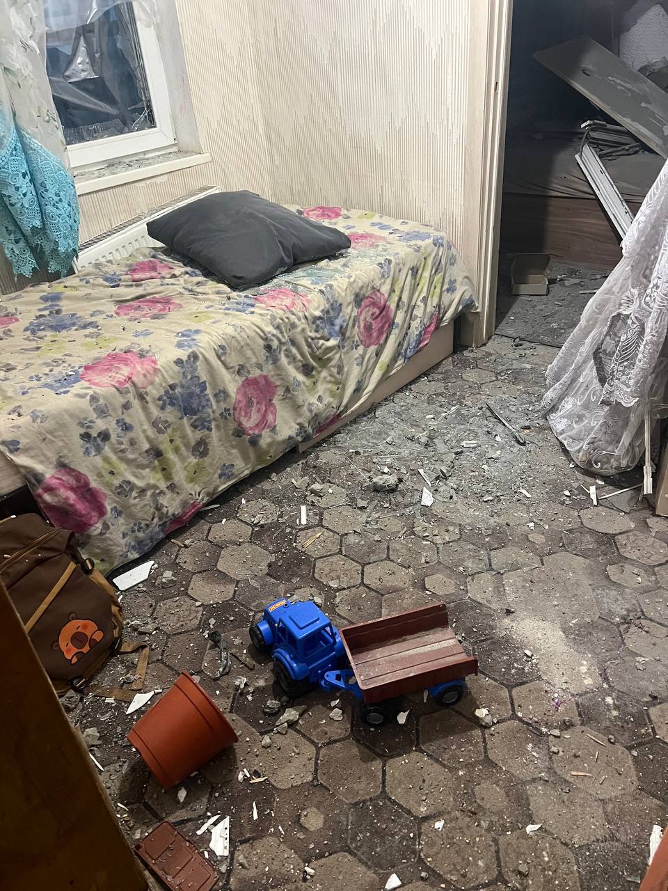 Удар пришелся по жилому дому, где проживает семья с четырьмя несовершеннолетними детьми. Дом получил серьёзные повреждения, чудом никто не пострадал.