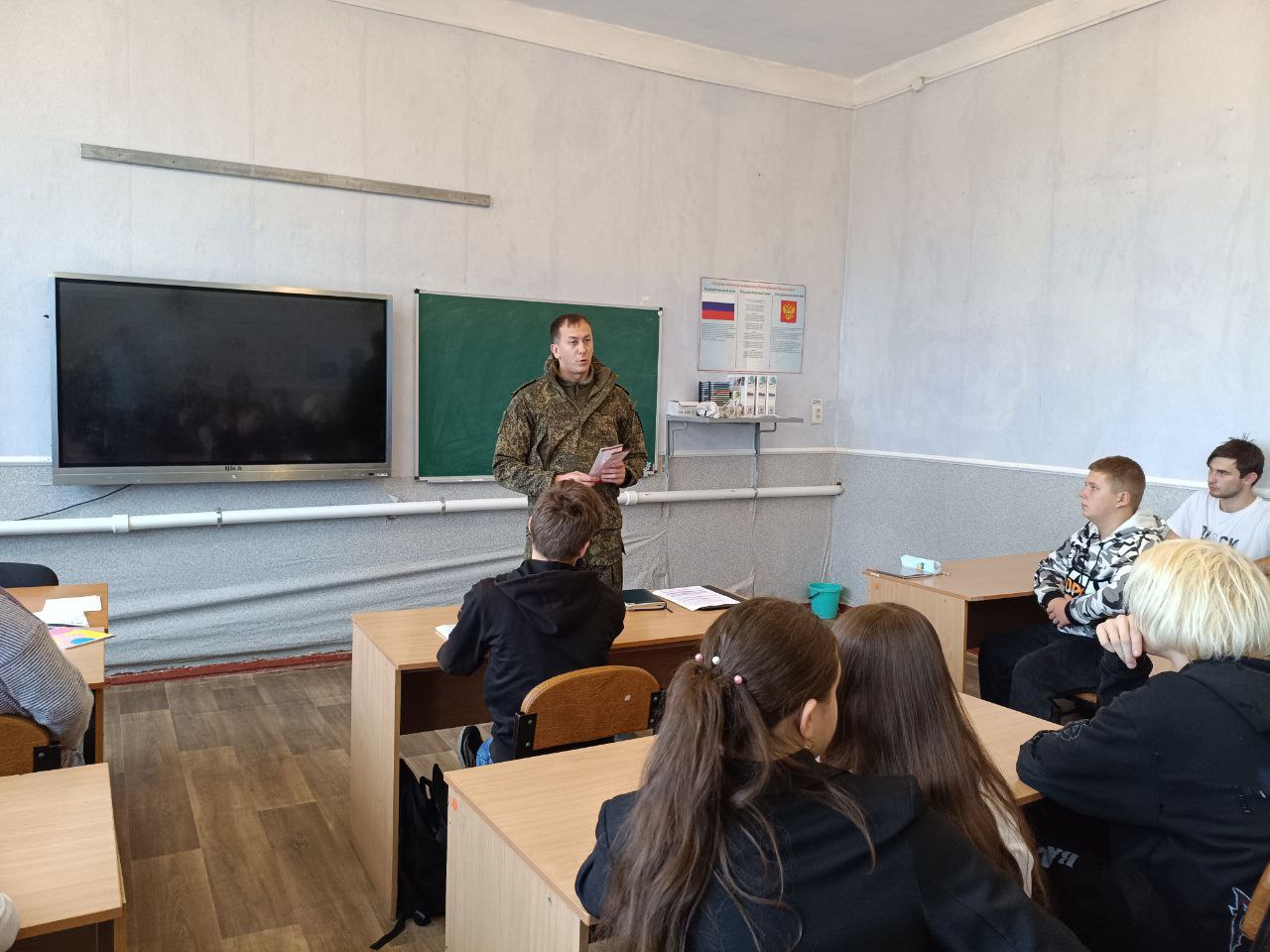 В ЛСШ №18 20.11.2025 г. прошло профориентационное мероприятие и урок мужества для учеников 9-11 классов. Временно исполняющий обязанности военного комиссара города Лисичанск Луганской Народной Республики рассказал обучающимся о возможностях поступления в военные ВУЗы.
