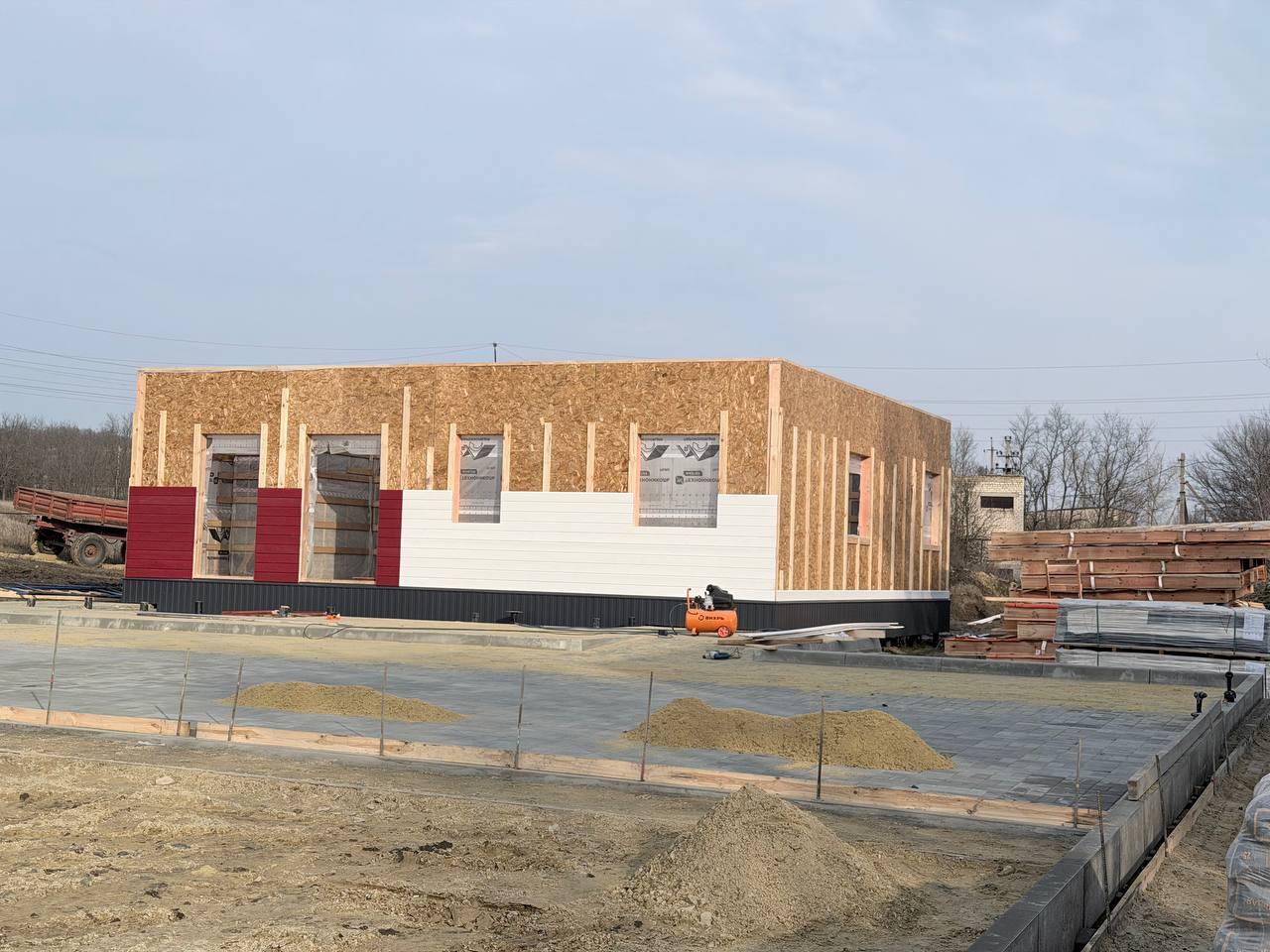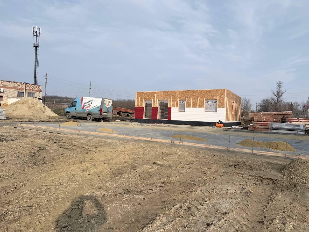 На прошлой неделе в Никольское из Костромы был доставлен домокомплект будущего здания. Костромские рабочие приступили к сборке домокомплекта. На данный момент ФАП готов на 40 %. Вкручены винтовые сваи – опора фундамента, собрана основная коробка здания. Параллельно ведется наружная облицовка ФАПа.
