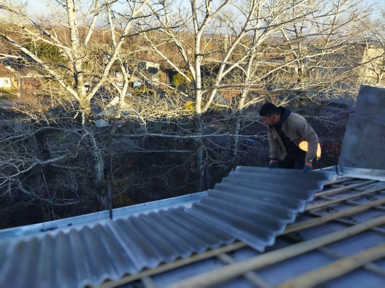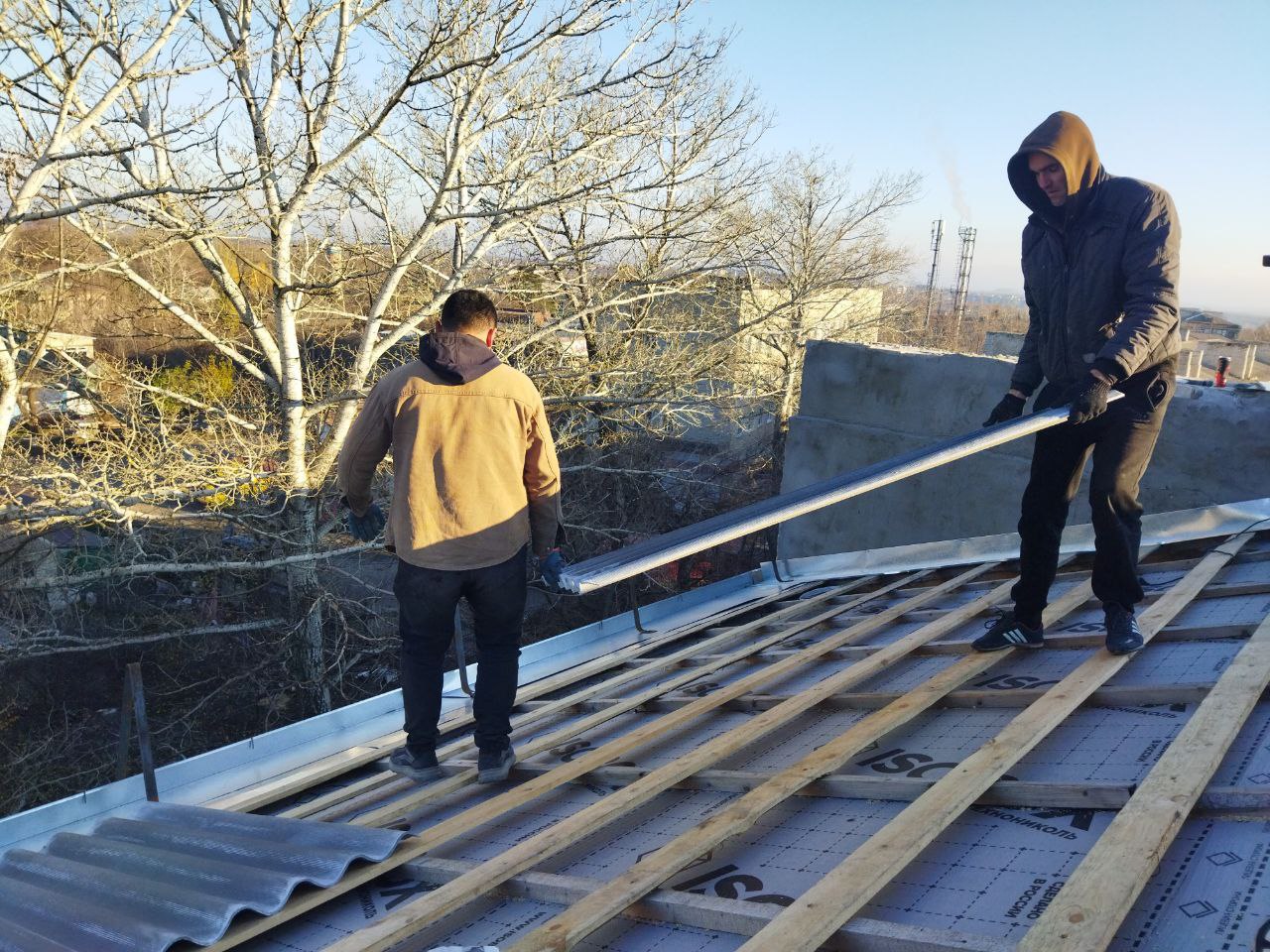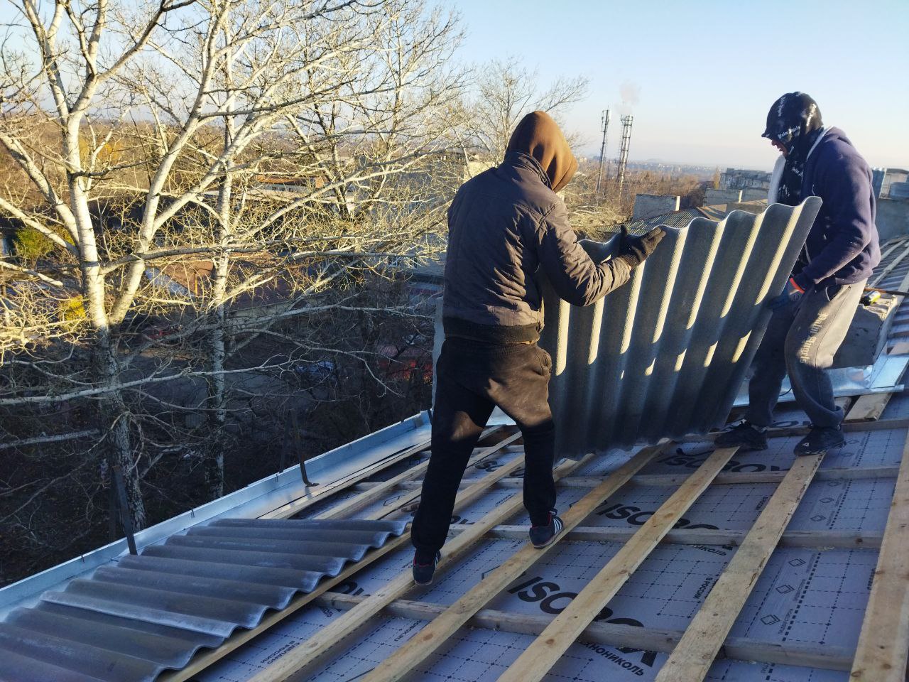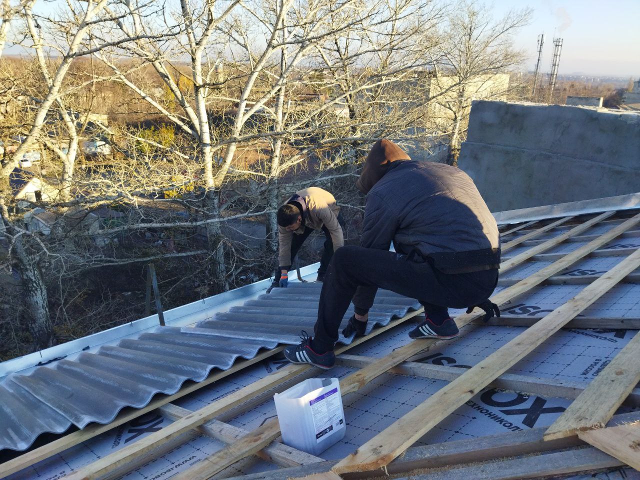 В настоящее время ведутся работы по устройству оцинкованных примыканий дымовых вентиляционных каналов, нового шиферного покрытия и системы ливневого водоотведения.