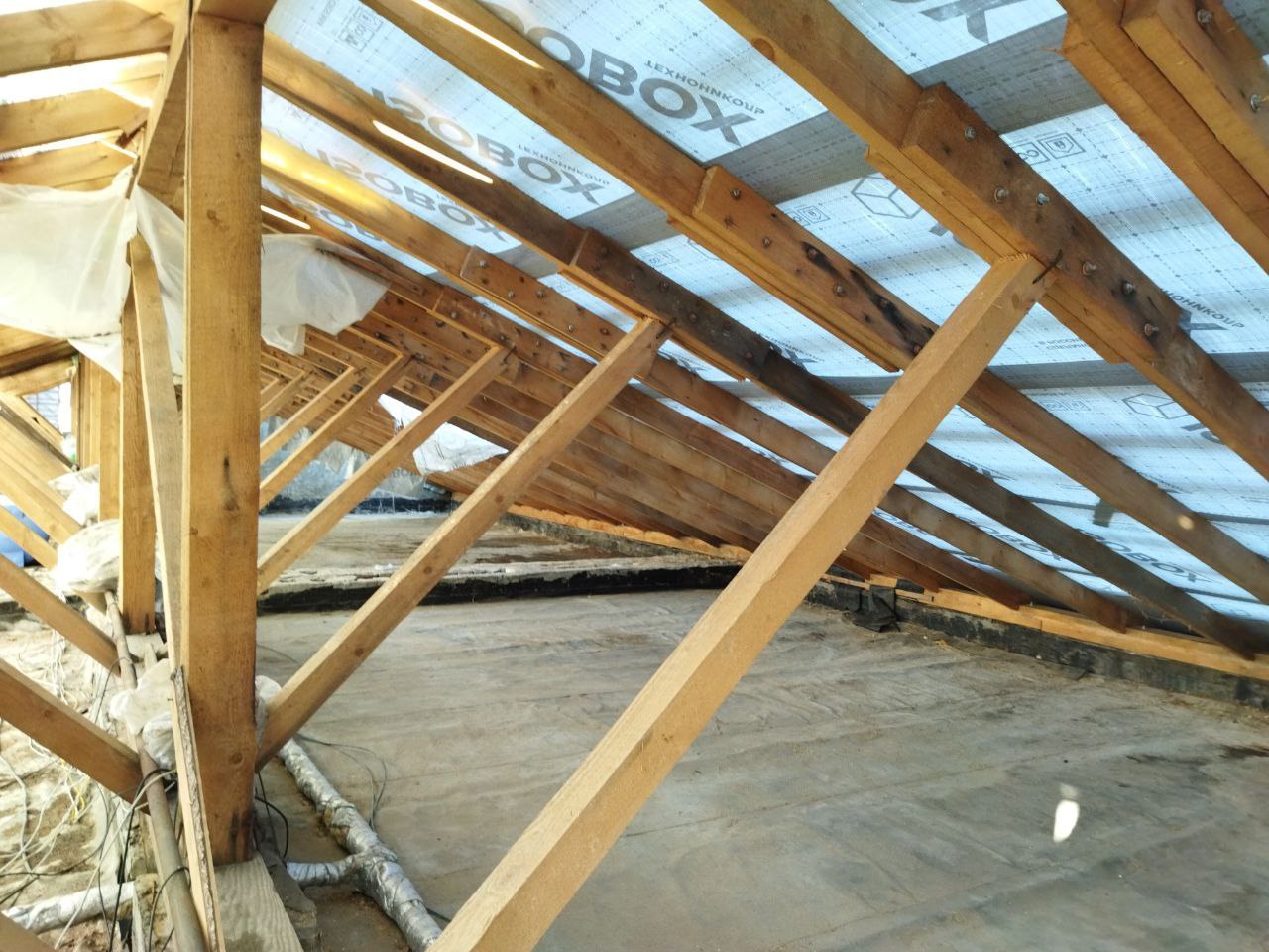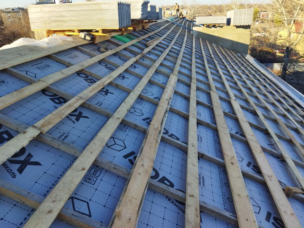 На сегодняшний день работы ведутся в доме № 37 по ул. Ленина. Подрядной организацией "Евростой - С" осуществлена замена стропильной системы, укладка новой обрешетки из досок и гидроизоляционной пленки.