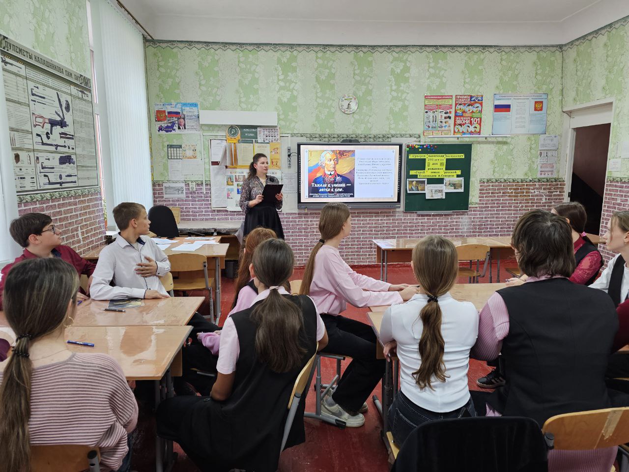 Классный руководитель 9-Б класса Примакова Анна познакомила ребят с графом Российской империи, генералиссимусом российских сухопутных и морских сил, генералом-фельдмаршалом австрийских и сардинских войск, кавалером всех российских и многих иностранных военных орденов. После просмотра краткого биографического видео ребята изучили награды А.В. Суворова, раскрыли значение личного герба и герба семьи Суворовых-Рымниковских, а также поучаствовали в викторине по правилам военного дела. Для многих этот урок стал огромным открытием и воодушевляющим примером.