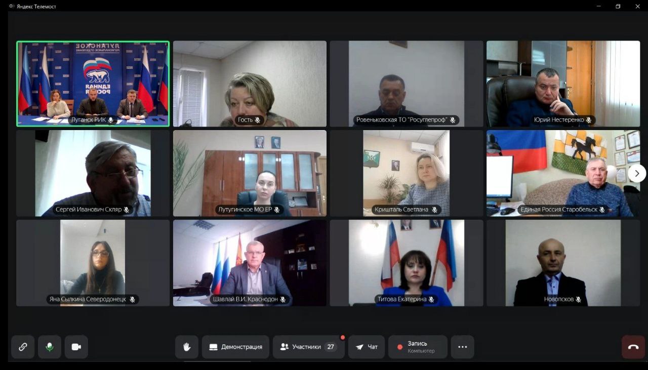 26 ноября в режиме видеоконференции прошло общее собрание Совета руководителей депутатских объединений ВПП "Единая Россия" Луганской Народной Республики. В нем приняли участие Председатель фракции Джан Погодин-Новиков, заместитель Председателя фракции Игорь Шахов и заместитель Председателя Совета городского округа Сергей Квачук.