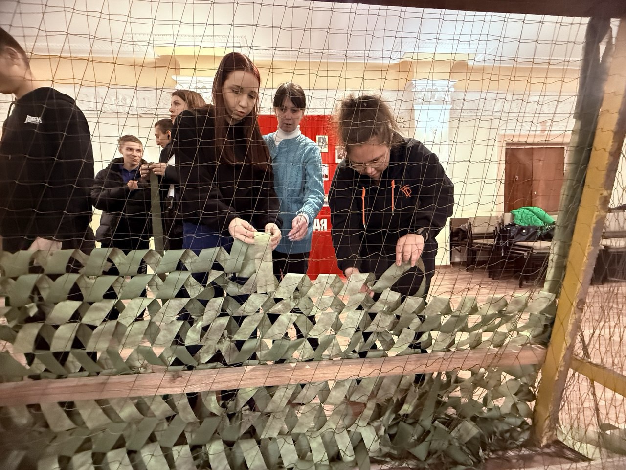 В рамках акции «Za Победу» сегодня состоялся очередной мастер-класс по плетению маскировочной сети для военнослужащих. Активистки партпроекта «Женское движение Единой России», неравнодушные жители города, школьники из общеобразовательных учреждений, СШ №1 и СШ №3, учащиеся «Кировского транспортного техникума», председатель комиссии по патриотическому воспитанию и член молодежного парламента при народном совете ЛНР Елена Андреевна Прудникова, специалист по организации работы «Движения Первых» в городском округе Кировск ЛНР Артем Александрович Кирейчик, секретарь первичного местного отделения партии «Единая Россия» № 8 Юлия Сергеевна Мороз – люди разных возрастов и профессий, объединившись, сплели огромное полотно надежды и поддержки, которое вскоре отправится на фронт, чтобы укрыть и защитить наших бойцов. Каждый узелок, каждое переплетение нитей – это частица души, вложенная в общее дело, символ единства и веры в победу.