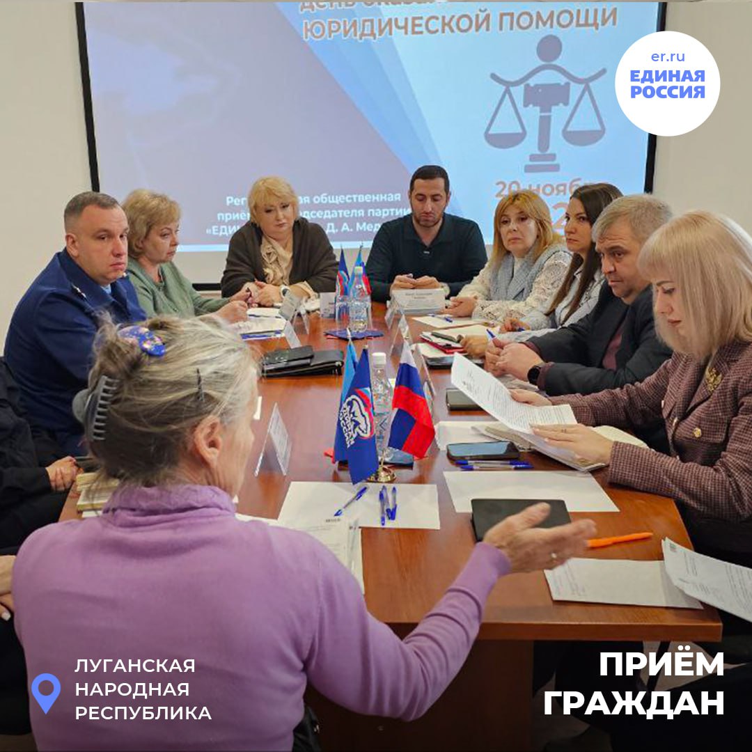 В рамках Всероссийского Единого дня оказания бесплатной юридической помощи провели совместный прием: уполномоченный по правам человека в ЛНР Анна Сорока, уполномоченный по правам ребенка в ЛНР Инна Швенк, министр юстиции ЛНР Андрей Гребенщиков, председатель Совета Регионального отделения Общероссийской общественной организации «Ассоциация юристов России» в ЛНР Виктория Тютюнникова и другие представители ведомств республики.
