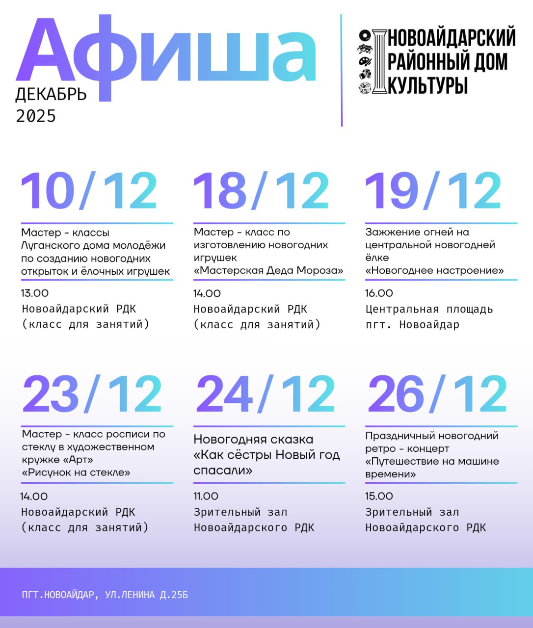 пгт. Новоайдар) 20.12.2025, 12:00 - Московская программа, уникальный мультимедийный спектакль «МультиЁлка. Школа волшебников». (Новоайдарский РДК, зрительный зал)