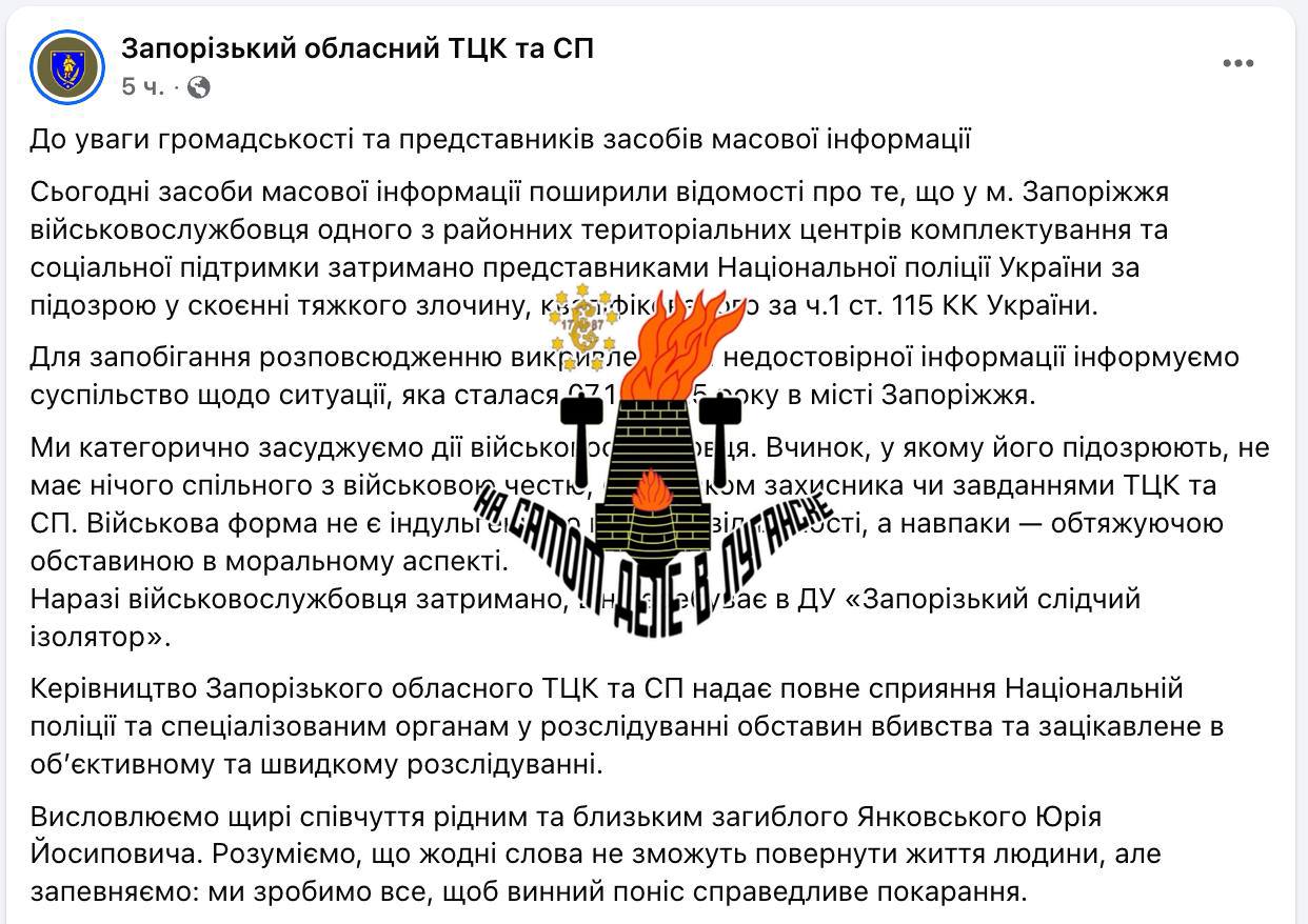 В Запорожье задержали сотрудника одного из ТЦК по подозрению в умышленном убийстве.