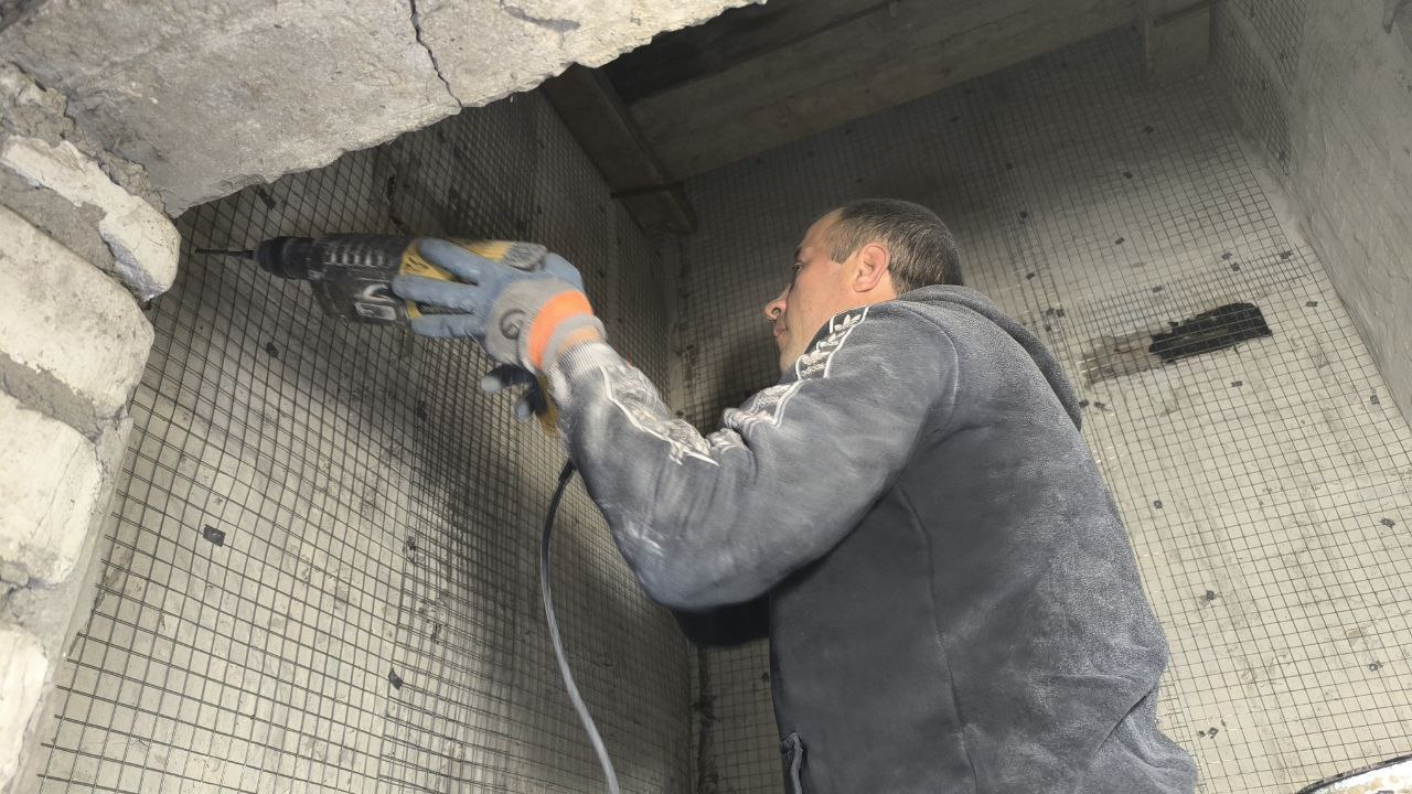 В шахтах пятого и шестого подъездов демонтаж уже завершен. Сейчас там занимаемся армировкой. Усиление строительных конструкций выполняем с помощью сетки. И сразу же приступим к отделке