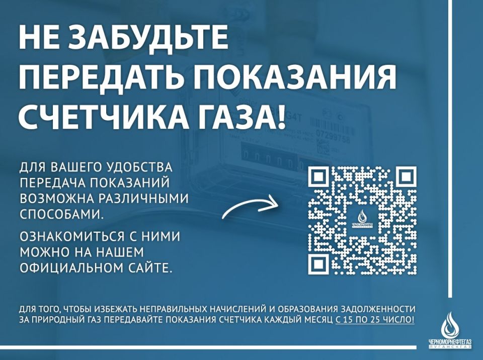 «Луганскгаз» филиал ООО «ЧМНГ» напоминает абонентам о необходимости передавать показания приборов учета газа с 15 по 25 число каждого месяца.