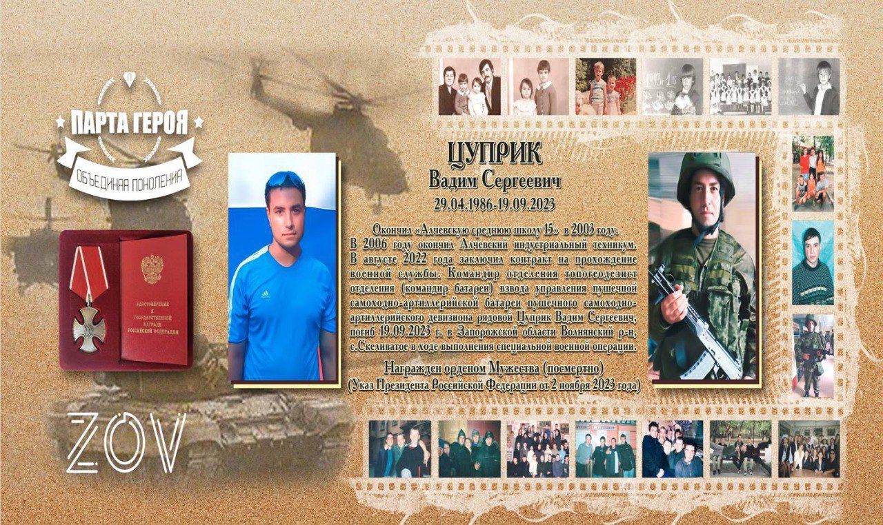 В Алчевской средней школе №15 прошло торжественное открытие Парты Героя в рамках проекта "Новая школа". Парта Героя посвящена участнику СВО Цуприку Вадиму Сергеевичу, выпускнику ГБОУ ЛНР "АСШ №15".