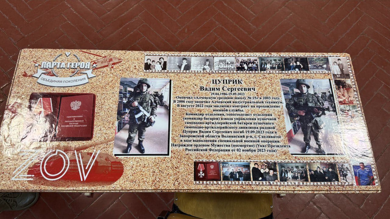 Накануне одна из парт появилась в Алчевской средней школе №15. Ученический стол посвящен памяти участника СВО Вадима Цуприк. На открытии присутствовала мать Героя Валентина Цуприк, а также заместитель главы г.о. город Алчевск, член местного политсовета «Единой России» Сергей Зайцев, ветераны спецоперации, единороссы, а также педагоги и учащиеся школы.