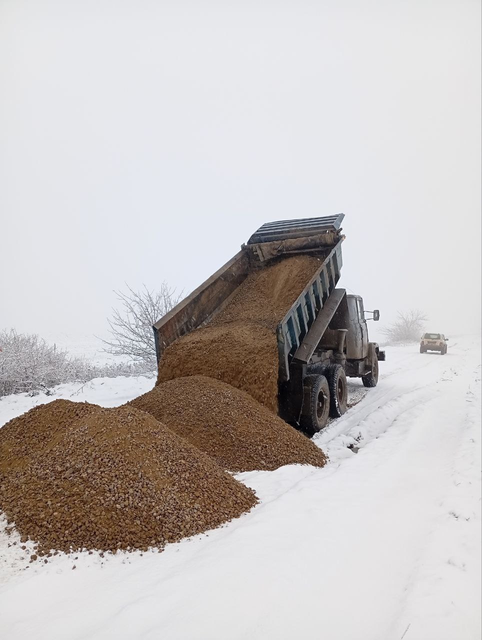 После завершения работ грейдированию специалисты продолжают подсыпку дорожного полотна щебёночно-песчаной смесью.