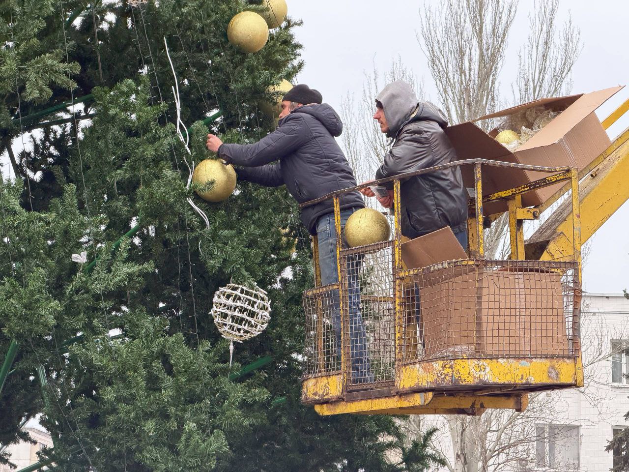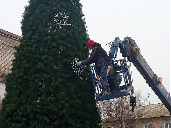 А на Михайловке новогоднее украшение площади у ДК имени Островского готовили всем поселком.