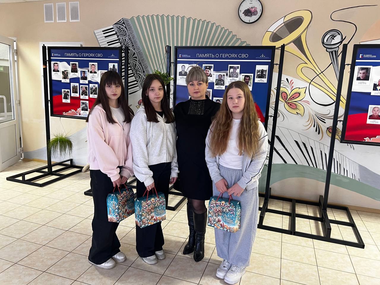 На мероприятии присутствовали дети погибших участников СВО. Юным краснодонцам были переданы сладкие подарки от Главы Луганской Народной Республики.
