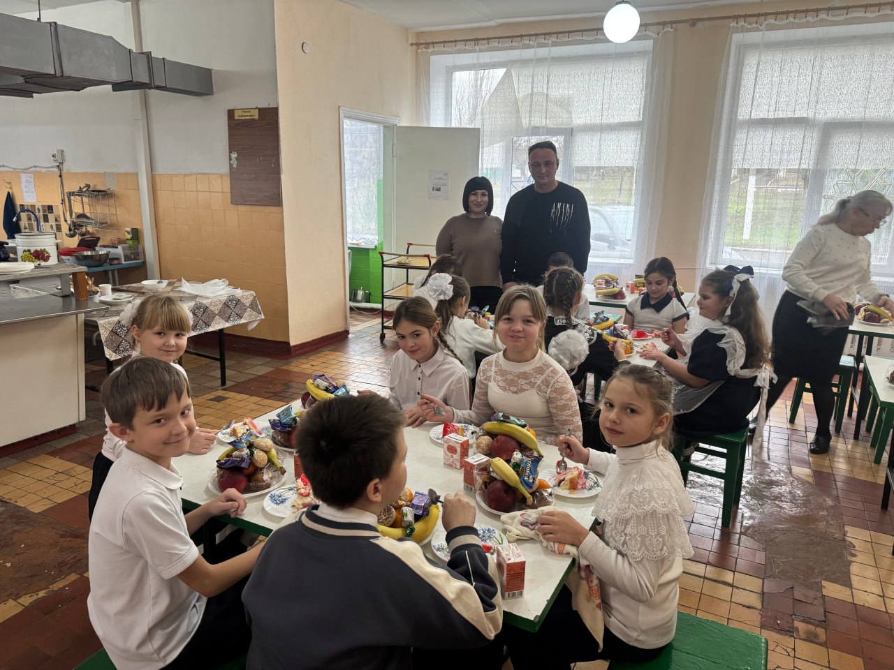 Они поздравили всех с праздником и организовали для школьников сладкий стол.