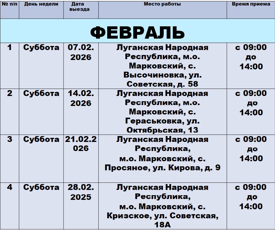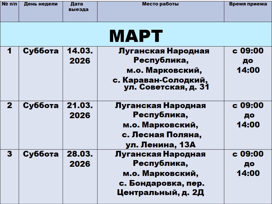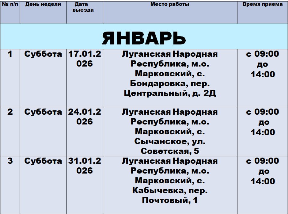 Государственное бюджетное учреждение Луганской Народной Республики«Многофункциональный центр предоставления государственных и муниципальных услуг» предоставляет график (режим) работы выездного обслуживания (мобильный офис) отделением Марковского района ГБУ ЛНР «МФЦ» на 1 квартал 2026 года.