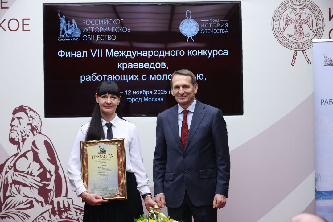 Почетные грамоты и дипломы лауреатам вручал лично председатель Российского исторического общества Сергей Нарышкин. Среди тех, кто был отмечен наградой за вклад в сохранение и популяризацию местного наследия, была Дина Щербина – педагог из города Ровеньки.