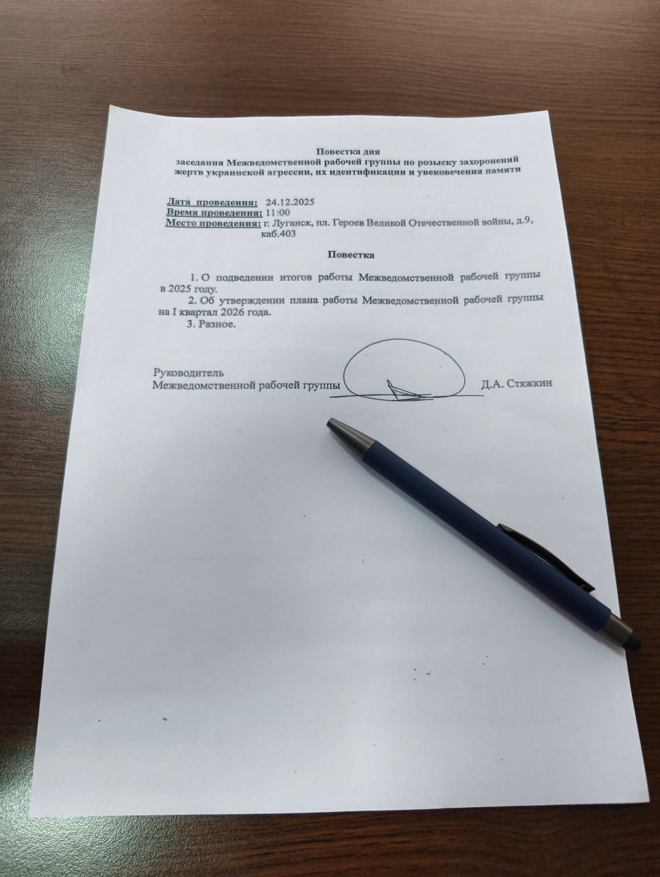В преддверии Нового года в Луганской Народной Республике прошло очередное заседание Межведомственной рабочей группы (МРГ) по розыску захоронений жертв украинской агрессии, их идентификации и увековечению памяти. Участники собрались, чтобы подвести итоги 2025 года, обсудить трудности и наметить планы на ближайшее будущее.