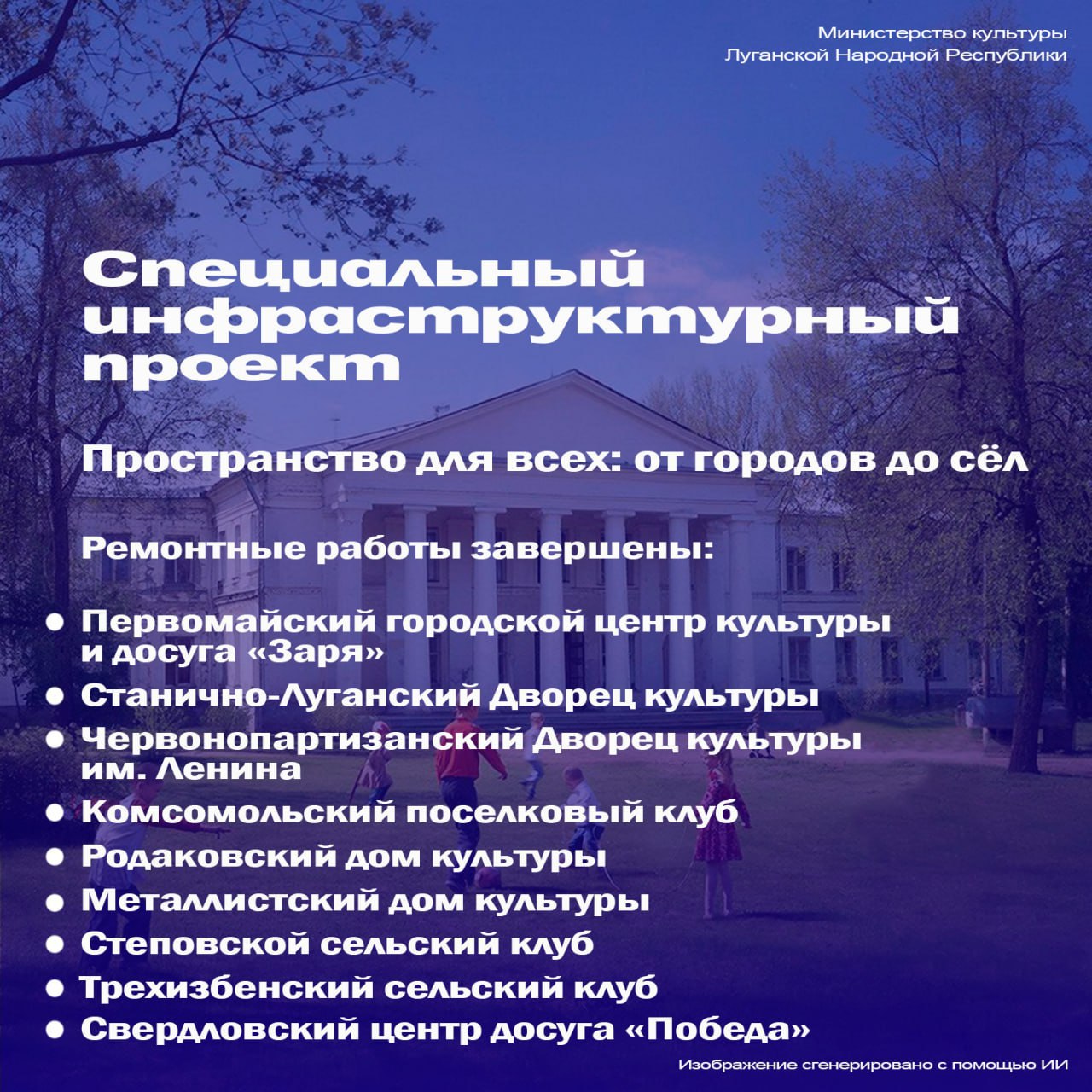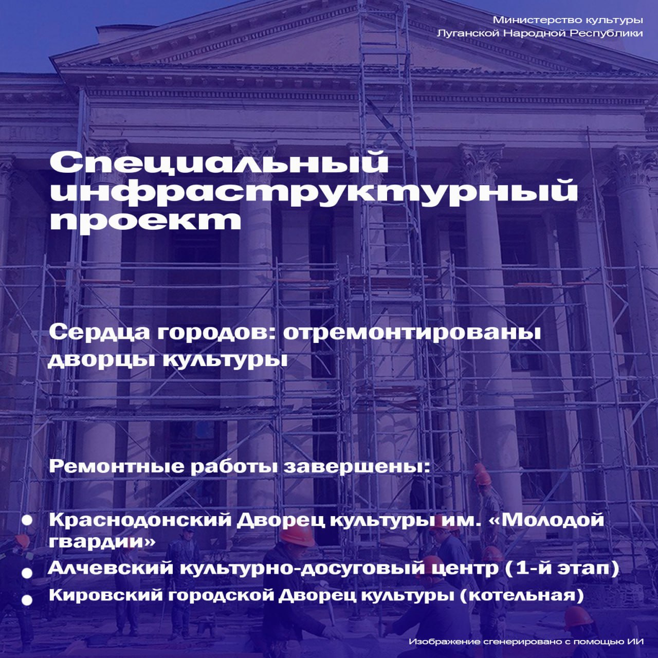 В рамках Специального инфраструктурного проекта в 2025 году капитально отремонтировано и реконструировано 16 объектов культуры по всей Луганской Народной Республике. От крупных городских дворцов до сельских клубов — везде кипела работа, чтобы создать для вас современные, безопасные и комфортные условия, где рождаются таланты, сохраняется память и строится наше общее будущее.