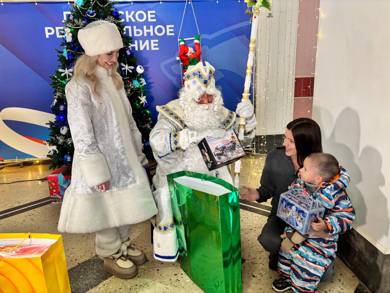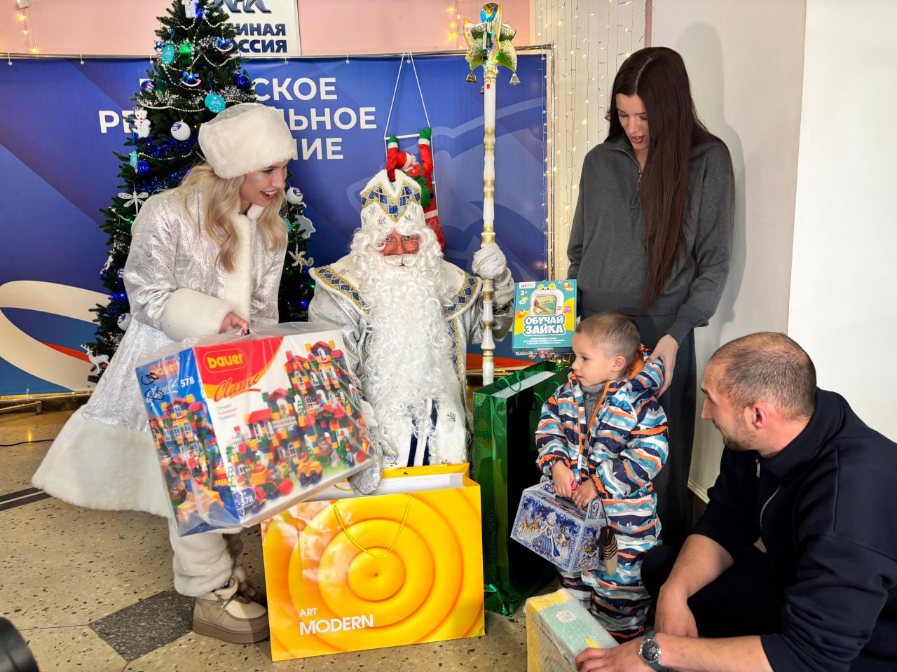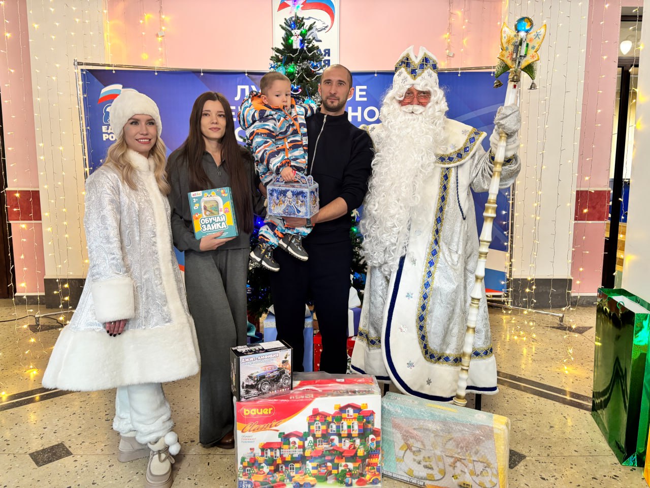 По его просьбе настоящий Дед Мороз вместе со Снегурочкой вручили маленькому гостю подарки в Луганском региональном отделении партии «Единая Россия».